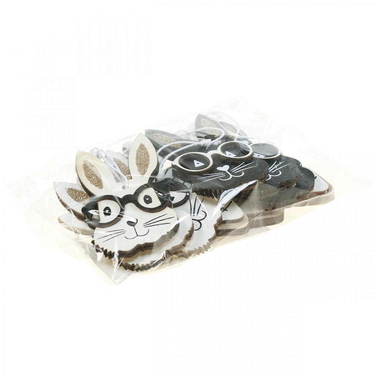 Der Glitter ist einheitlich in Gold gehalten. Die Holzhasen hingegen sind unterschiedlich gestaltet. So erhalten Sie drei weiße Hasen mit schwarzer Brille und schwarzem Gesicht sowie drei schwarze Hasen mit weißer Brille und weißem Gesicht. Ein Hingucker ist neben der Brille aber auch das Gesicht. Wirken die Augen wie kleine Dreiecke mit Punkt in der Mitte, erinnert die Nase an ein Herz, an dem sich Hasenscharte und Mäulchen wie ein Anker anschließen. Der goldene Glitter schmückt die