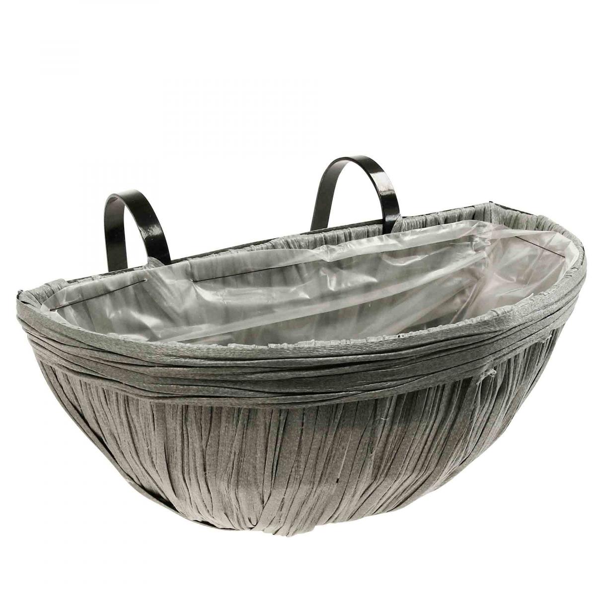 Die zwei stabilen Henkel zum Einhängen tragen das ganze Gewicht von Hängetopf, Erde und Pflanze. Der Balkonhängetopf besteht aus einem halbrunden Metallgitterkorb, um den graue Kunststoffbänder geflochten sind.