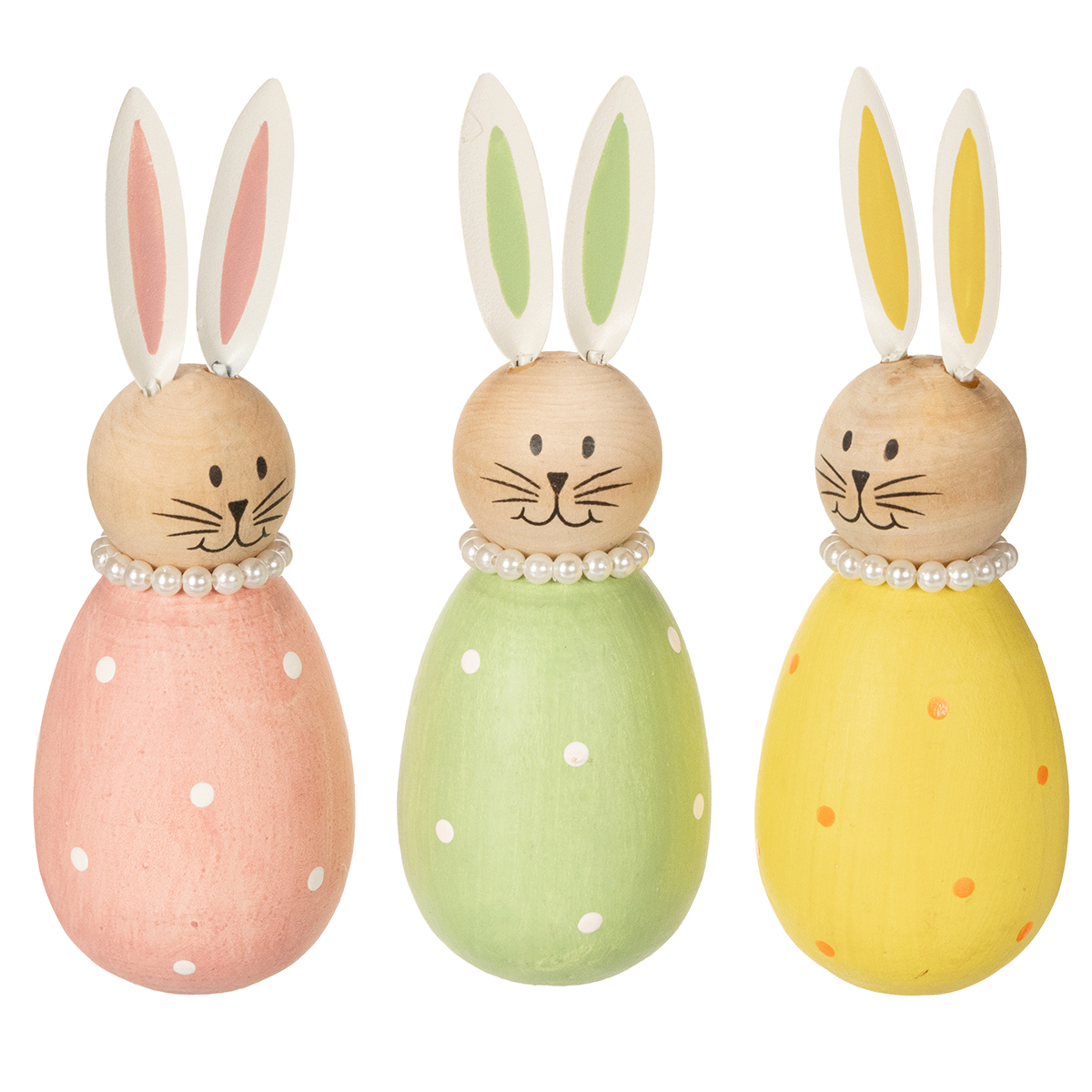Realizzati in legno, hanno un aspetto di alta qualità, mentre i dettagli in metallo e plastica, come la collana di perle, ne sottolineano il fascino giocoso. Che il vostro stile sia country, moderno e minimalista o vintage, questi coniglietti pasquali si adattano con stile a qualsiasi ambiente. Le delicate tonalità di giallo, rosa e verde li rendono dei veri e propri oggetti versatili, che donano armonia cromatica e leggerezza a qualsiasi ambiente.