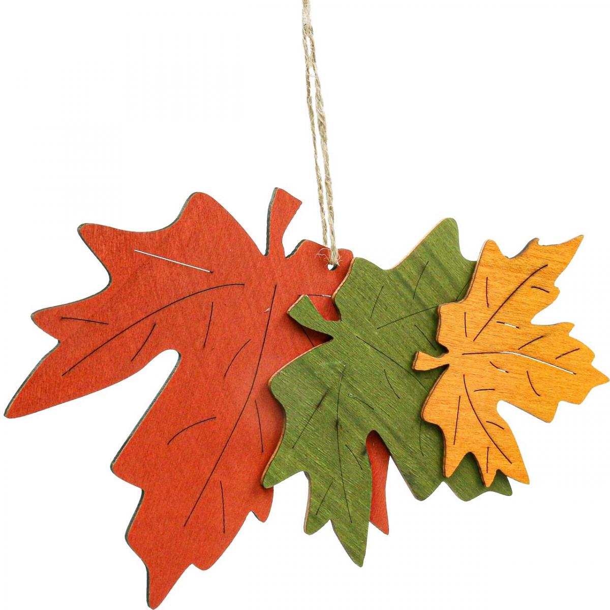 Queste decorazioni autunnali in legno sono realizzate con adorabili foglie d'acero. Ottieni i colori brillanti e luminosi delle foglie a casa.La decorazione autunnale è composta da una foglia d'acero rossa, una verde e una arancione, che sono state unite a formare un pendente. I contorni e le nervature fogliari delle foglie sono stati elaborati in modo particolarmente filigranato.