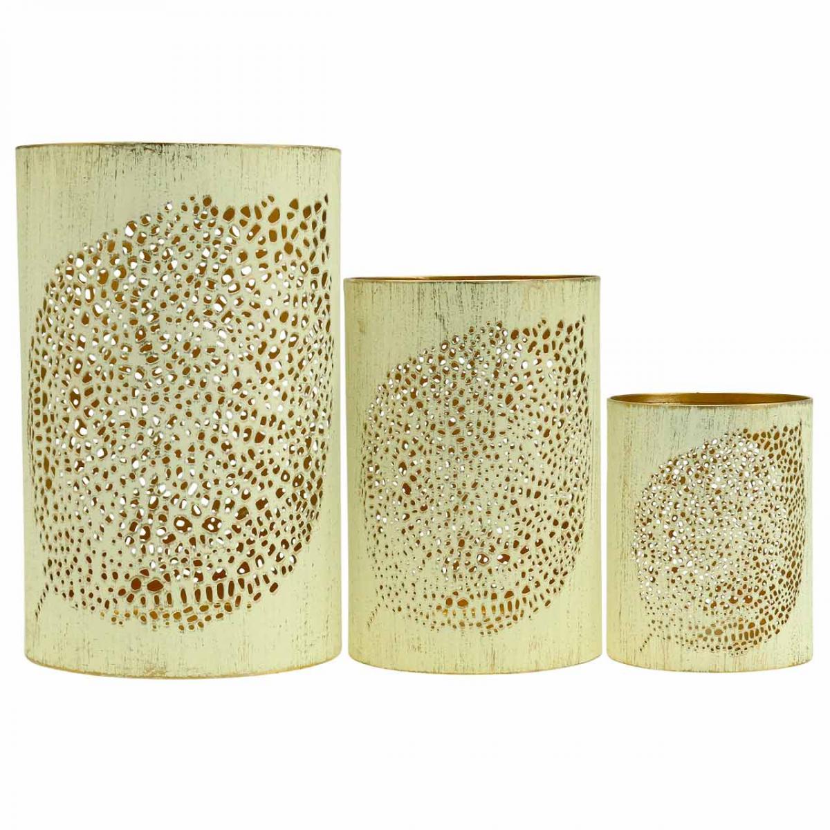 Sie erhalten die Windlichter aus Metall im Vintage-Stil im Set zu drei Stück in unterschiedlicher ineinander stapelbarer Größe.