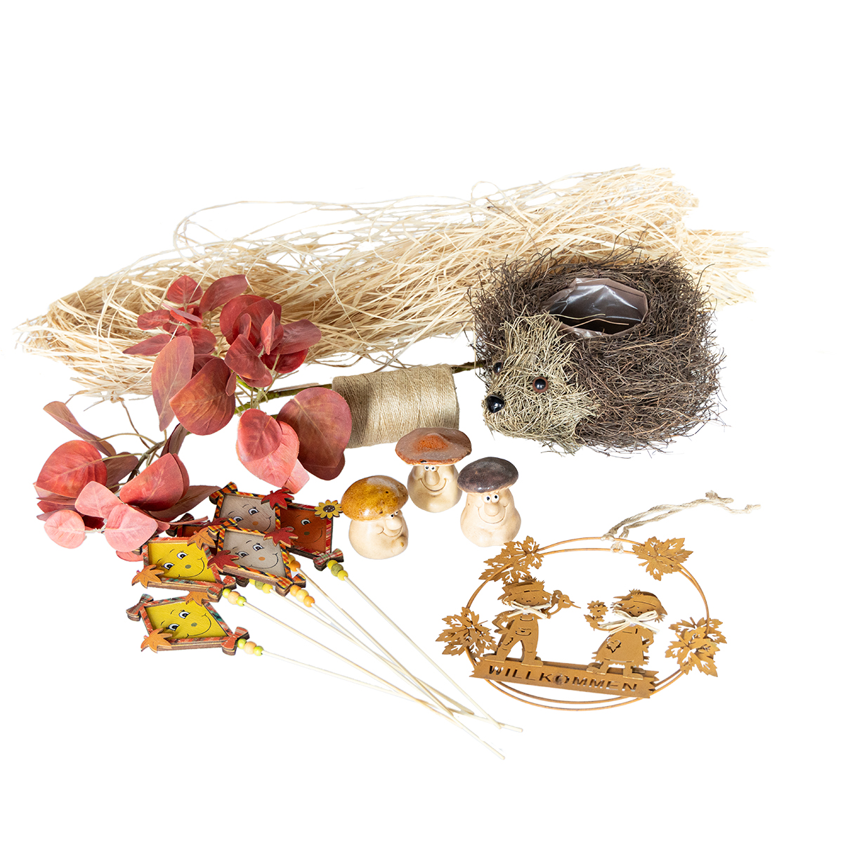 Unser Herbstdeko-Set vereint alles, was Sie für eine stimmungsvolle Herbst-Dekoration brauchst. Der niedliche Igel aus Reben wird zum Hingucker in rustikalen und gemütlichen Räumen – perfekt für den Landhausstil. Ergänzt wird er durch Miniatur-Pilze in warmem Braun, Beige und Rostrot sowie verspielten Blumensteckern, praktischem Jutegarn und realistischen roten Herbstblättern als Kunstpflanze und einem Willkommensschild in Rost.