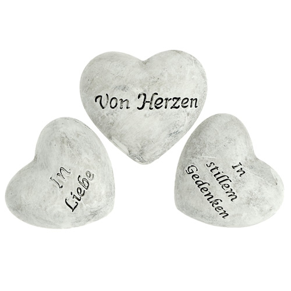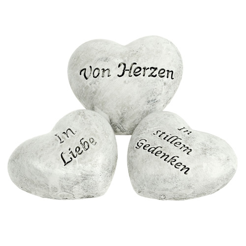 Pour les mots qui manquent dans le deuil, il y a ce cœur avec une écriture en gris. Avec les pensées de deuil suivantes, qui ont été gravées avec amour dans ces cœurs décoratifs, les sentiments des personnes en deuil peuvent être exprimés en un mot: "In Love", "In Silent Memory" et "From the Heart". Les petits coeurs de bijoux sont fabriqués en polyrésine résistante aux intempéries et à la pluie. Ainsi, chaque cœur portant un sort de deuil constitue un bijou de sépulture idéal.Le matériau facilite également le collage des coeurs commémoratifs sur toutes sortes de surfaces. Par exemple, sur des couronnes mortuaires ou des vases à fleurs pour la tombe. Mais même comme un simple écart entre un arrangement de fleurs, le cœur s'impose.