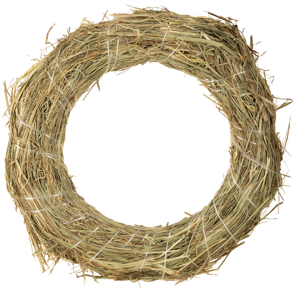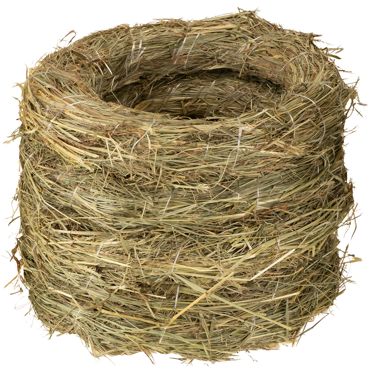 Les couronnes de foin sont liées ensemble en paquet de 5 pièces au total et sont toutes fabriquées à la main. Du foin de haute qualité a été sélectionné, qui a ensuite été roulé en anneau puis attaché à l'aide d'une corde en nylon. C'est pourquoi les dimensions peuvent toujours varier légèrement ; Les couronnes ont un diamètre extérieur compris entre 26 et 27 centimètres environ. Le diamètre intérieur est d'environ 19 centimètres et la hauteur est d'environ 4 centimètres.