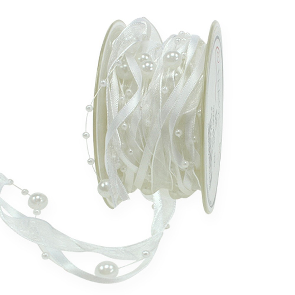Das Hochzeitsband in Weiß hat eine Länge von etwa 5 Metern und ist auf eine Rolle aus Kunststoff gewickelt. Die Breite beträgt in etwa 20 Millimeter und die Perlen haben einen Durchmesser von ungefähr 0,2 bis etwa 0,8 Zentimetern.