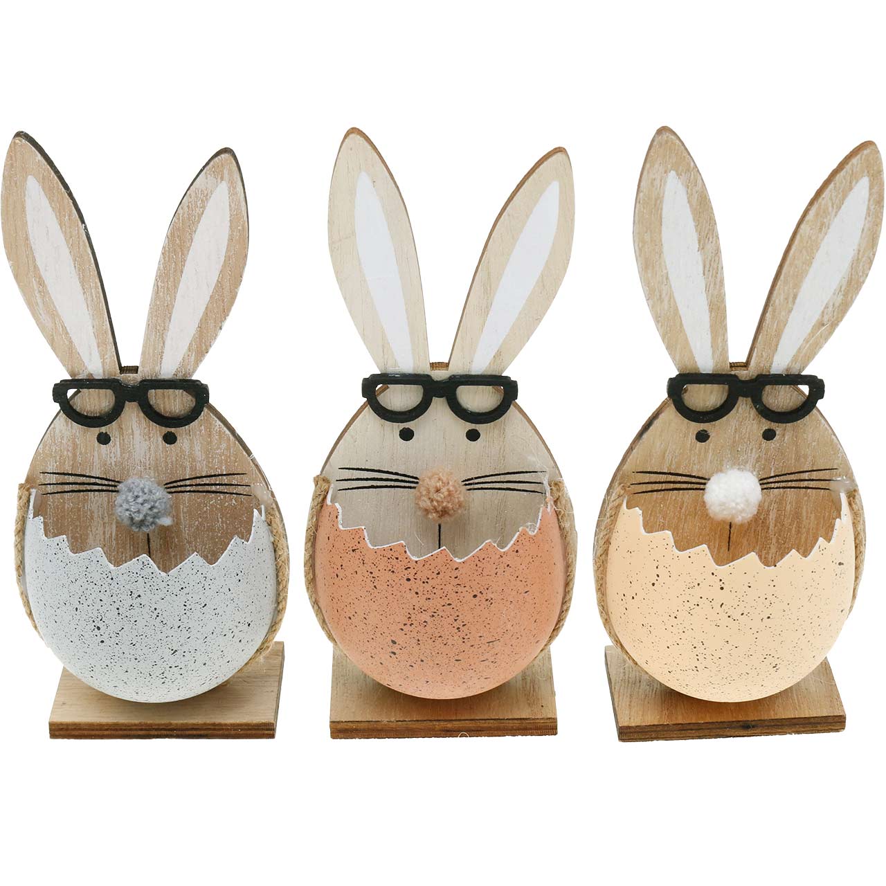 Coniglio di legno in un uovo, decorazione primaverile, conigli con occhiali, coniglietti pasquali 3pz