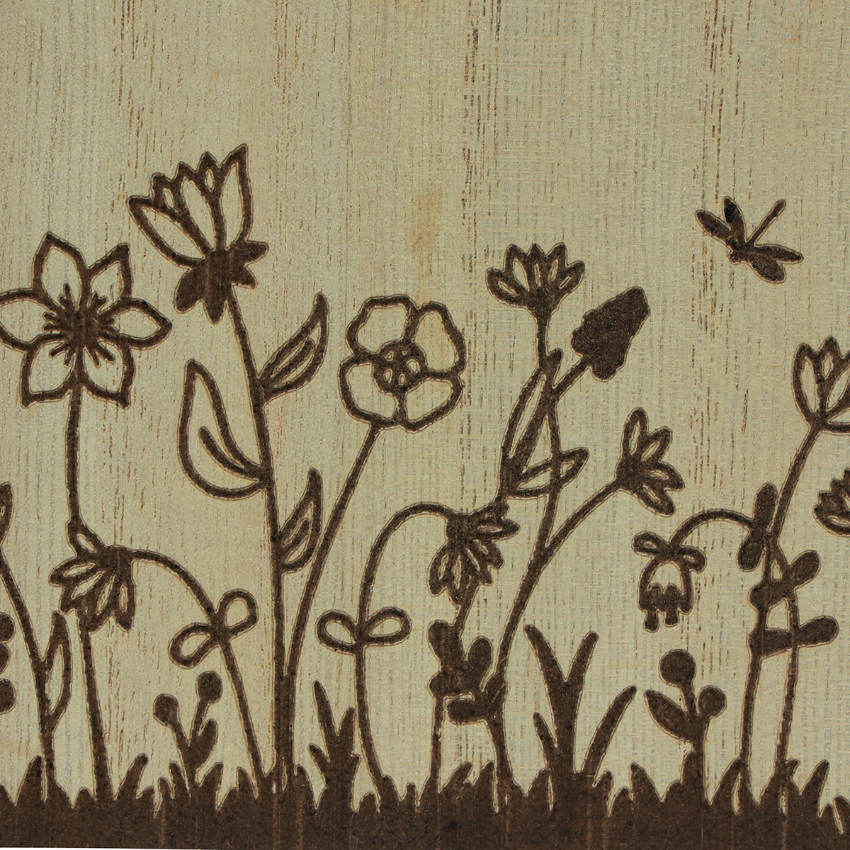 Questa bellissima scatola di legno è decorata sulla parte anteriore con un motivo floreale a fuoco di vari fiori e libellule. Per la sua forma e dimensione è perfetto come portapenne per la scrivania.Ma puoi usare il grazioso contenitore in legno MDF anche per qualcosa di più di un semplice organizer da scrivania. Posiziona piante artistiche o essiccate o utilizza un inserto in vetro per fiori freschi: ora hai un vaso di legno alla moda dall'originale design rettangolare.