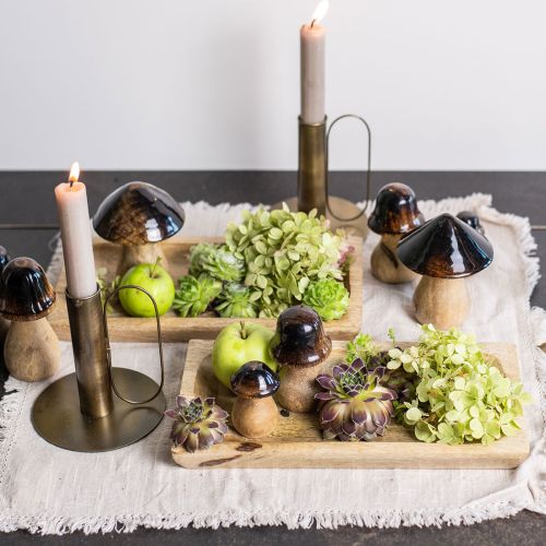 Gestalten Sie mit echten oder künstlichen Beeren, Moos und Herbstblättern eine bunte Herbstdeko. Ein oder mehrere Holzpilze mit Glasur geben Ihrer Tischdeko oder einem Gesteck dann einen glamourösen Touch. Deshalb passt auch goldene Herbstdeko wunderbar zu den Holzpilzen.