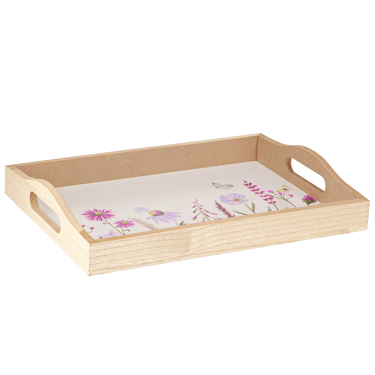 Plateau en bois rectangulaire nature fleurs papillon L35cm