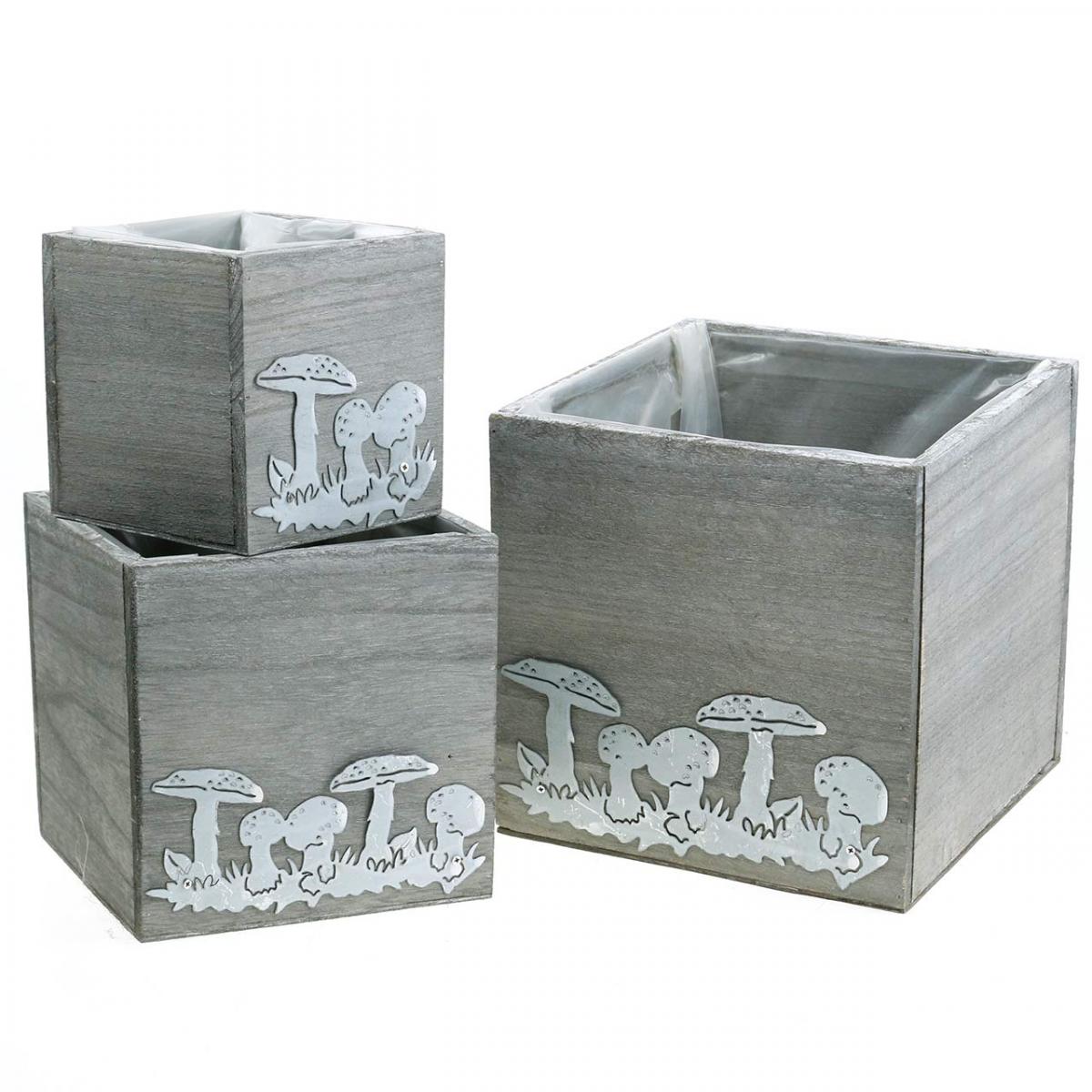 Holzwürfel mit Pilzen, Herbstdeko, Pflanzkiste 20/16/12cm 3er-Set
