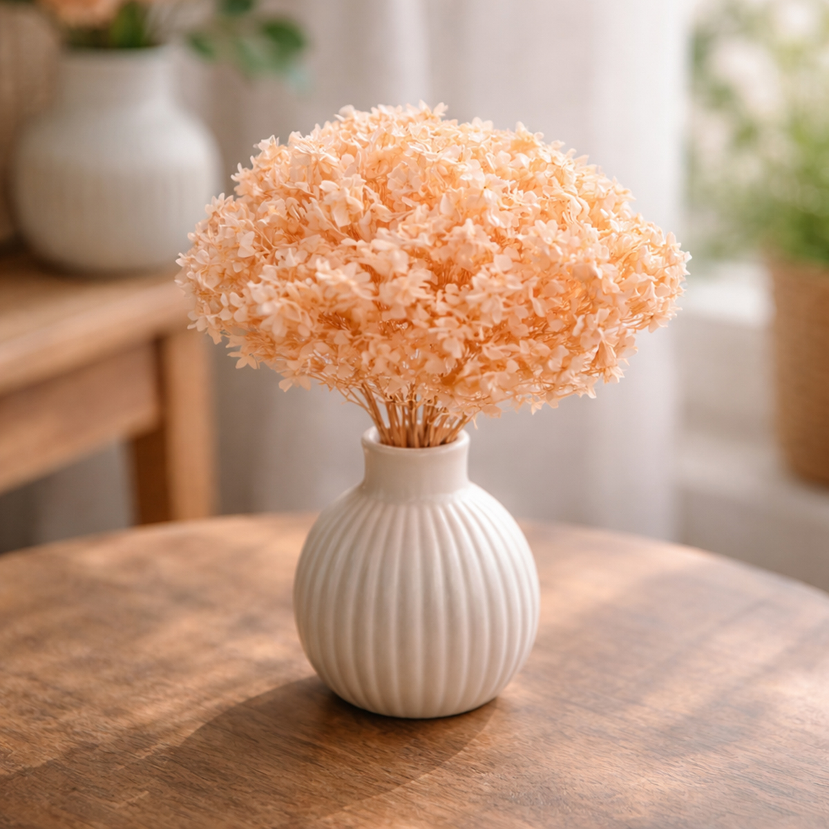 Nos hortensias séchés s'intègrent parfaitement à tous les styles, qu'ils soient modernes, scandinaves ou champêtres romantiques. Leurs grandes fleurs orange clair apportent une touche de douceur et de chaleur à votre décoration et ne manqueront pas d'attirer les regards. Disposez le bouquet dans un vase simple pour mettre en valeur sa beauté naturelle, ou associez-le à d'autres fleurs séchées pour une composition plus raffinée. Il est particulièrement adapté à la décoration du salon et de la salle à manger, mais aussi aux mariages et autres événements. Un seul suffit à habiller une pièce d'une élégance florale.