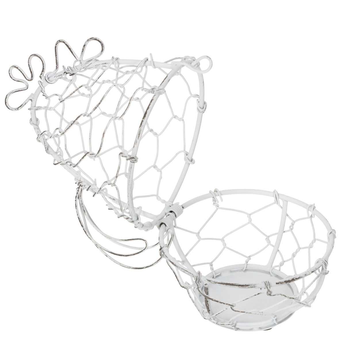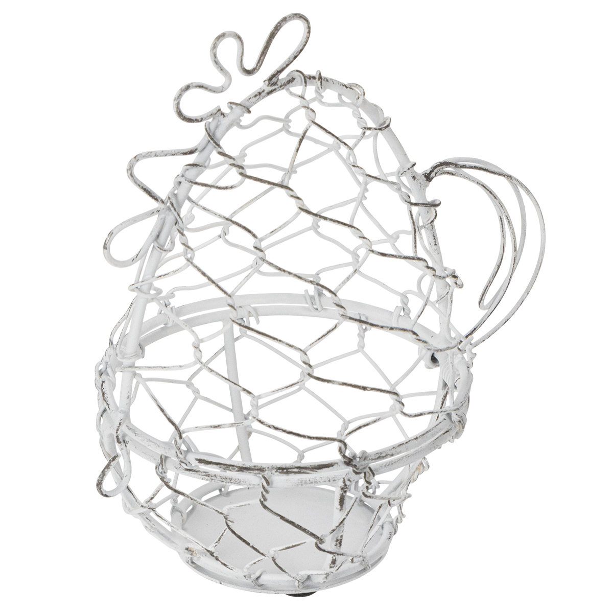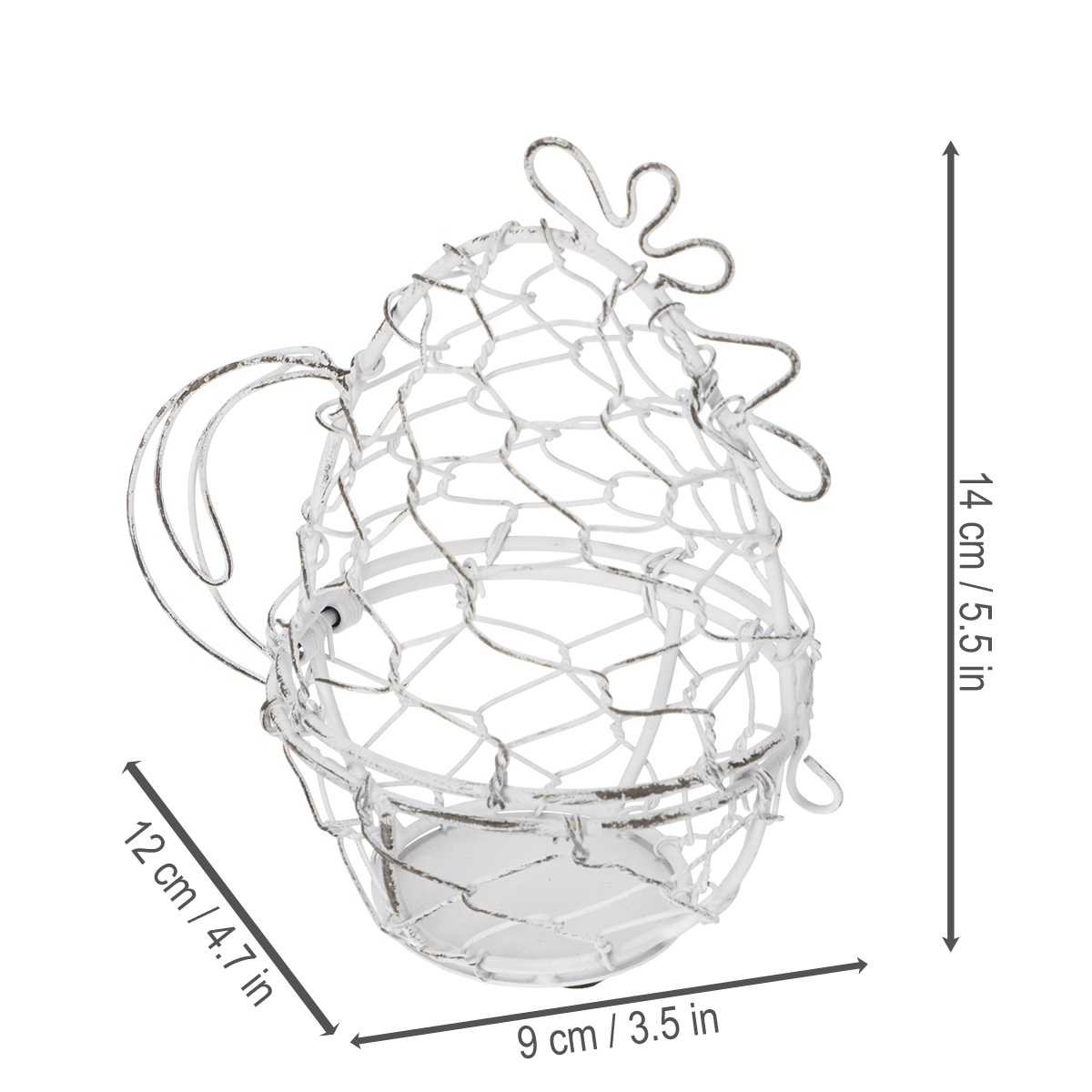 Questo cestino in filo metallico a forma di gallina non è solo accattivante, ma anche estremamente pratico. Con i suoi 14 cm di altezza e 12 cm di diametro, è la dimensione perfetta per le vostre uova di Pasqua. La robusta struttura in metallo bianco accentua l'affascinante look shabby-chic, che unisce un'eleganza sobria a un tocco rustico. Il design senza tempo si adatta a una varietà di stili d'interni, dal country al vintage, fino al moderno.