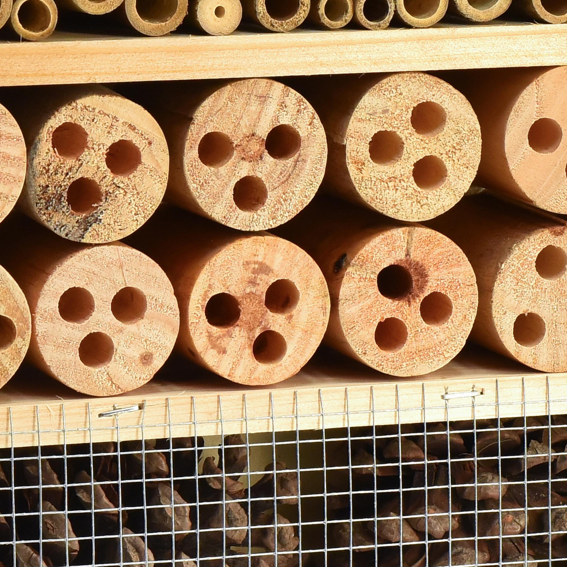 L'hotel per insetti ha un bellissimo tetto marrone. Nel sottotetto della casa degli insetti sono stati installati dei tubi che servono, ad esempio, per la nidificazione delle vespe parassite e delle api selvatiche.Al piano di sotto ci sono altre case per questi insetti, questa volta si tratta di pezzi di legno rotondi con fori. Al piano terra, infine, sono presenti dei tenoni sciolti nel vano, tenuti in posizione dalla rete metallica fissa.