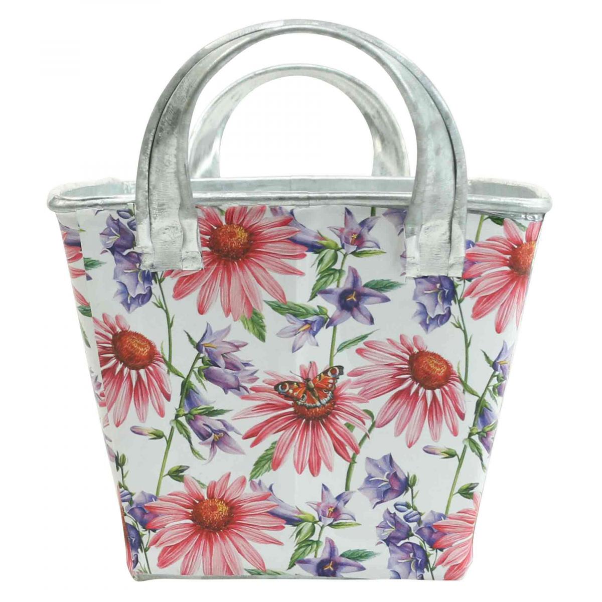 Rosarote und lilafarbene Frühlingsblumen auf weißem Grund bilden einen abwechslungsreichen und optimistischen Rahmen. Das Blumenmotiv wurde auf eine robuste Folie gedruckt, die wiederum auf dem Zinkgefäß klebt. Auf diese Weise bildet die Innenseite mit dem silberfarbenen Zink einen starken Kontrast in der Frühlingsdeko.