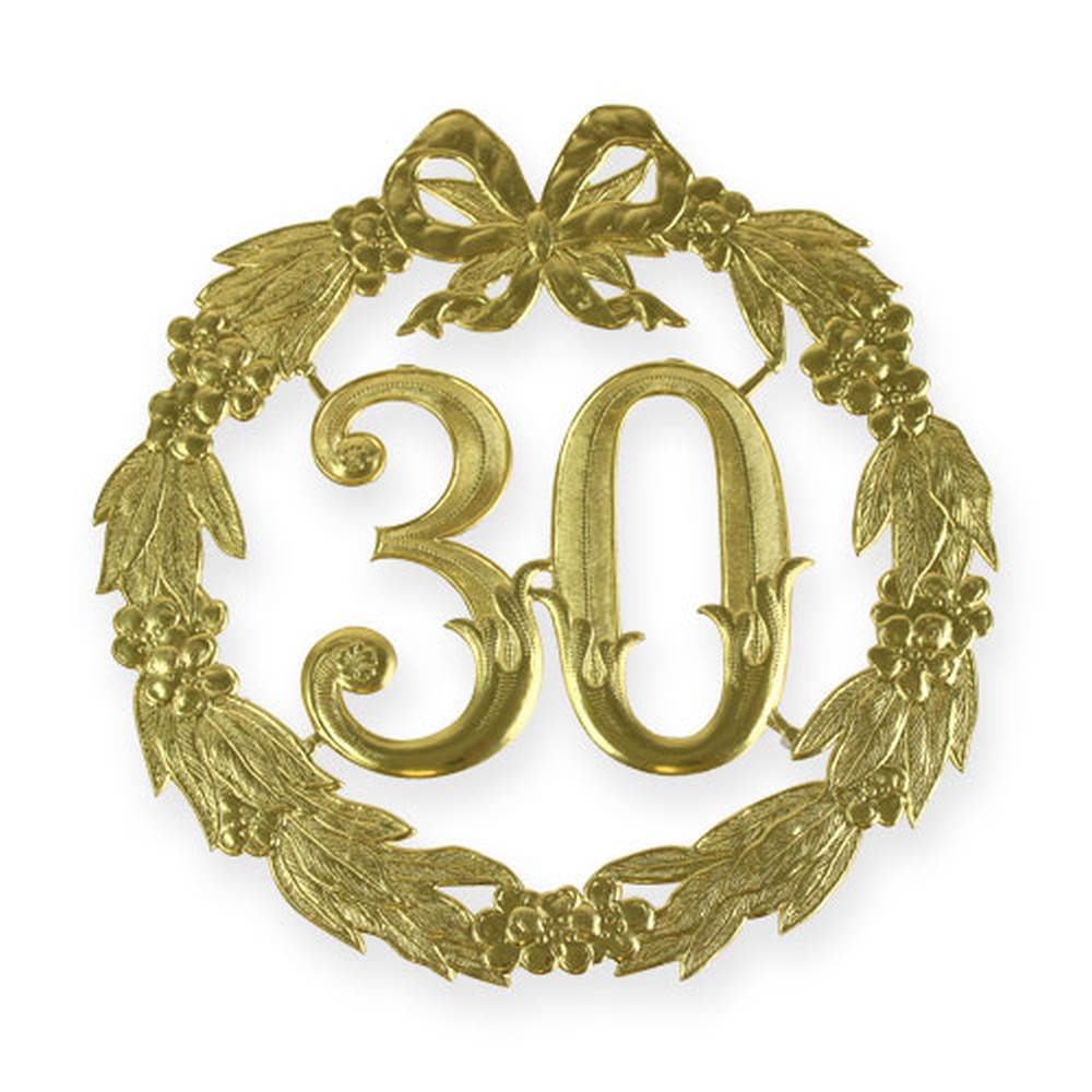 Der Durchmesser der Jubiläumszahl „30“ in Gold beträgt circa 24 Zentimeter. Dank der hervorragenden Verarbeitung aus hochwertigem, goldgeprägtem Karton können Sie die Deko-Zahl im Kranz auch mehrmals anwenden. Oder verschenken Sie den Zahlenkranz im Anschluss an die Feierlichkeiten als Andenken an die gemeinsame Zeit.