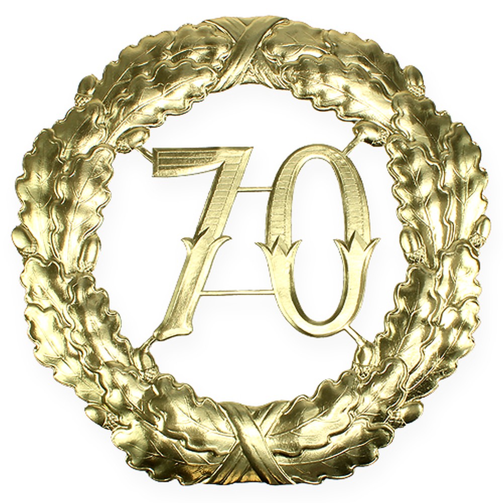 Si vous projetez de fêter un 70ème anniversaire ou le jubilé des 70 ans d’existence d’une entreprise ou d’une association, il vous faut une décoration digne de ce grand jour ! Ce numéro anniversaire doré „70“ se présente sous forme de couronne et pourra être fixé à l’aide d’un large ruban à l’entrée de la salle de réception. Grâce à sa taille généreuse, on peut le voir de loin et les convives trouveront sans difficulté le lieu des festivités.Ce chiffre festif est entouré d’une couronne de chêne et est fait en carton gaufré de grande qualité. Il conviendra également parfaitement à des fêtes d’associations, de village, de stands de tir etc…