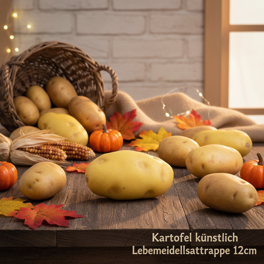 Dabei können Sie die Deko-Kartoffel mit weiterem Kunstgemüse wie Paprika, Tomaten, Zwiebeln und Pilzen kombinieren und Sie haben eine faszinierende Küchendeko, die garantiert nicht verdirbt und auch im Küchenstudio immer knackig frisch aussieht! Das Ganze können Sie auch auf Ihren Esstisch stellen und so für eine originelle Wohnzimmerdeko sorgen. Oder ergänzen Sie eine Erntedankdekoration mit diesem Deko-Gemüse und schmücken Sie so einen Flur, einen Wintergarten oder ein Schaufenster.