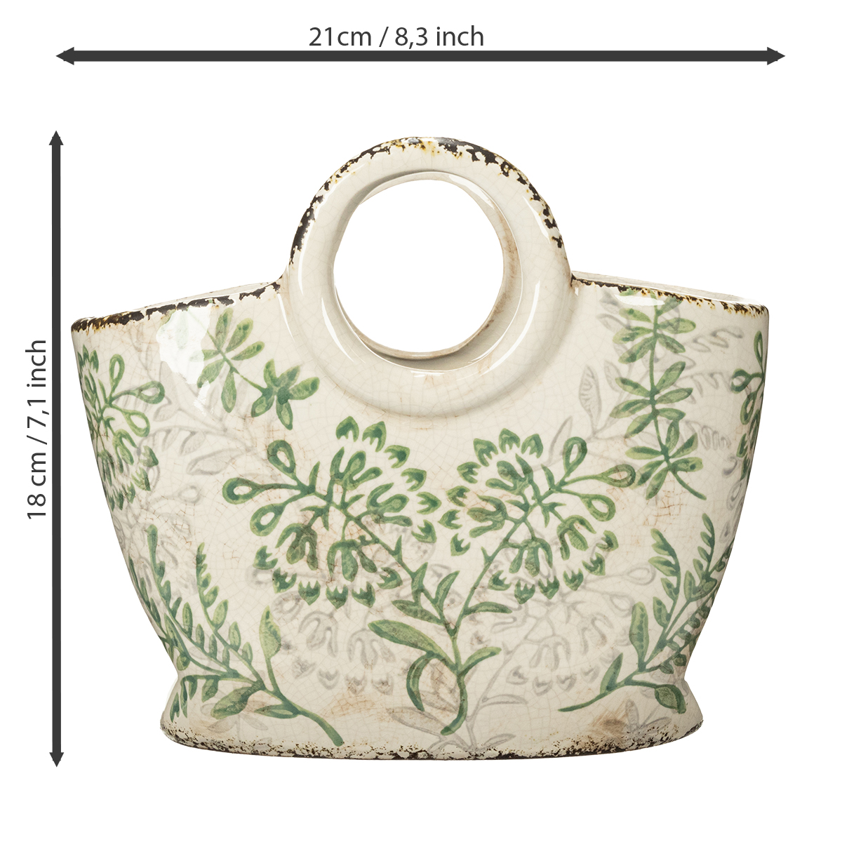 Sie suchen ein Pflanzgefäß, das den Wohnbereich verschönert und gleichzeitig einen Hauch von Vintage-Charme versprüht? Dann ist unsere Keramik Tasche genau das Richtige! Diese bezaubernde Tasche aus handbemalter Keramik ist nicht nur ein praktisches Gefäß für Kräuter, Blumen oder Dekorationen, sondern auch ein echter Hingucker. Das charmante Grün-Weiß-Design in Kombination mit dem liebevollen Blumenmuster bringt Naturnähe und Eleganz in jeden Raum. Egal, ob auf dem Balkon, im Wohnzimmer auf der Fensterbank oder als Tischdekoration – diese Tasche fügt sich harmonisch in jede Umgebung ein und sorgt für eine warme und gemütliche Atmosphäre.
