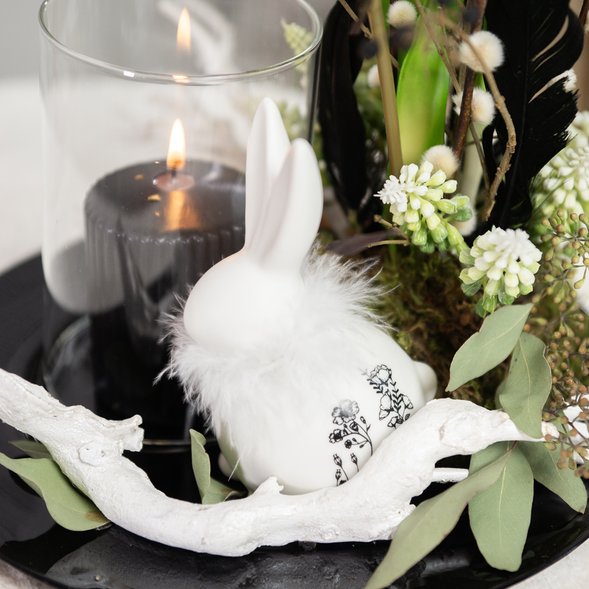 Die weiße Hasen-Deko spitzt die Ohren und auch ohne Gesicht sehen die Hasen aus, als würden sie neugierig nach vorn schauen. Auf dem runden Körper ist der Hase einseitig mit einem schwarzen Blumen-Muster geschmückt – wie ein Auszug aus einer Wiese, passend zum Frühling! Der weiße, flauschige Federkragen macht die Osterdeko noch lieblicher.