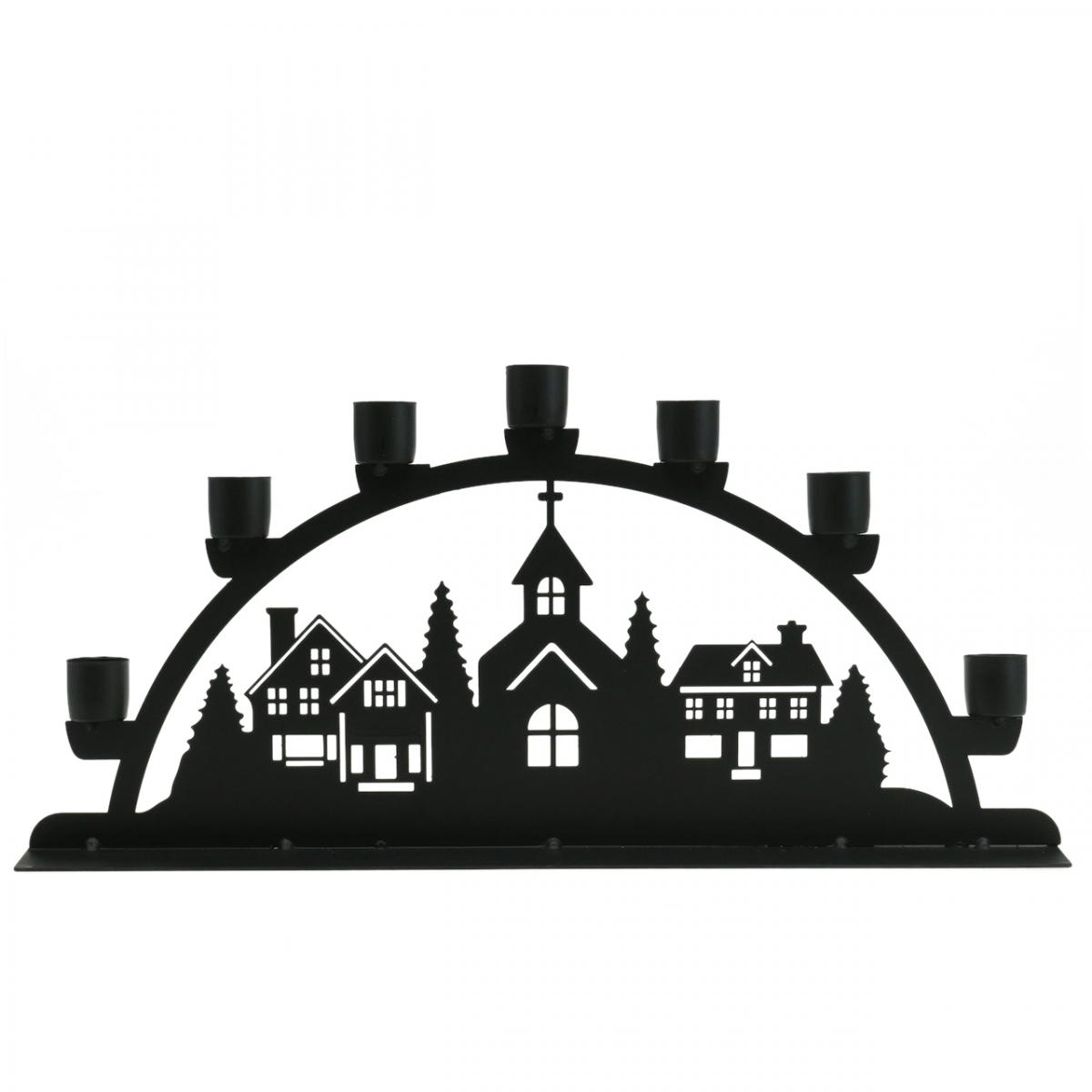L'arco delle candele ha le sue origini nei Monti Metalliferi e viene eretto nella stagione buia, quando le giornate si stanno accorciando di nuovo. Questo arco di luci in metallo è un portacandele per sette candele e viene utilizzato a Natale per l'illuminazione d'atmosfera alla finestra o in soggiorno.La popolare decorazione natalizia mostra la silhouette di rappresentazioni sceniche, che sono particolarmente suggestive alla luce delle candele. Questo arco di candela in metallo dal design moderno è dipinto di nero e mostra uno scenario di case e alberi che circondano un edificio di una chiesa cristiana. Gli incavi finemente lavorati sul metallo mostrano dettagli raffinati come finestre, porte e tetti. Il villaggio si anima mentre le candele tremolano.