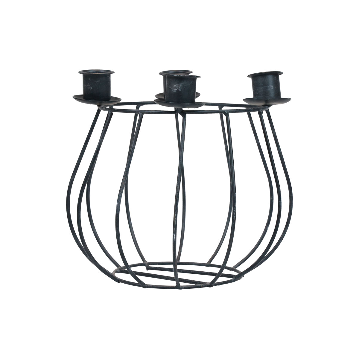 Leicht gebogen sind die Streben, die den Kerzenhalter formen. Von oben und unten schließen sie an einem Ring an. Der Boden ist zusätzlich durch kurze Streben stabilisiert, während auf der Öffnung im gleichen Abstand die Halterungen für Stabkerzen sitzen. Diese besitzen eine runde Auffangschale, sodass sich das herunterlaufende Wachs auf ihnen sammeln kann.