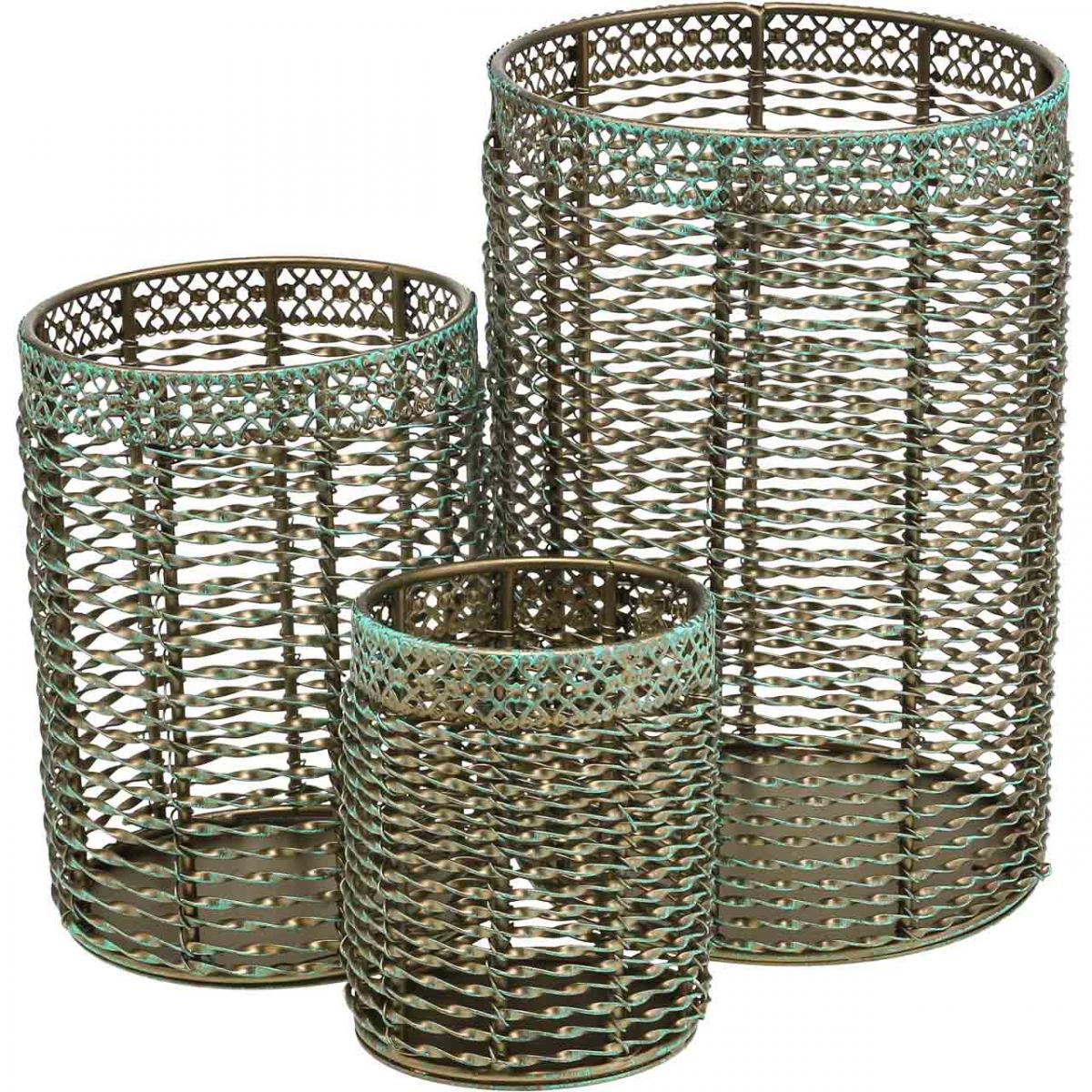 Questi portacandele rotondi in metallo deliziano tutti gli appassionati del look vintage alla moda. Il set è composto da tre portacandele di diverse dimensioni.Le strisce di metallo sono attorcigliate l'una nell'altra e disegnate ad arte per formare la forma cilindrica del portacandele. Il bordo metallico superiore è costituito da ornamenti particolarmente decorati. Il colore di base del portacandele è un nobile marrone dorato che è ricoperto da leggere pennellate turchesi e crea così una patina di rame artificiale.
