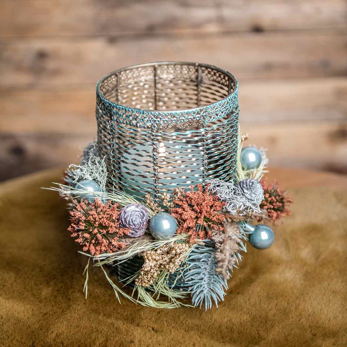 Die Metallstreifen sind ineinander gedreht und kunstvoll zu der zylindrischen Form der Kerzenhalter gestaltet. Der obere Metallrand besteht aus besonders ziervollen Ornamenten. Die Grundfarbe der Kerzenständer ist ein edles Goldbraun, das mit leichten türkisen Pinselstrichen überzogen ist und dadurch eine künstliche Kupfer-Patina erzeugt.