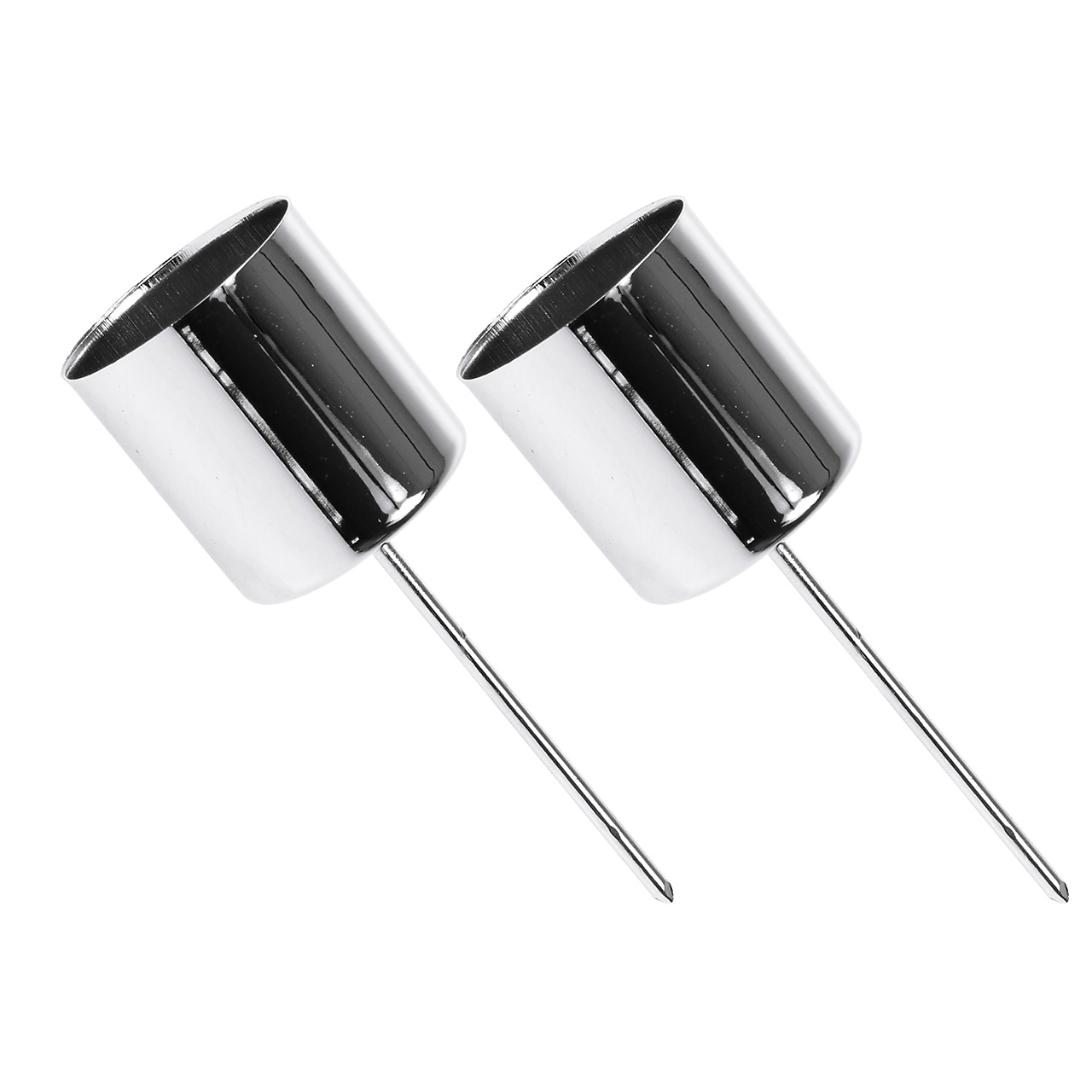 Die 4 silberfarbenen Kerzenhalter für Stabkerzen werden in einer Kunststoff-Verpackung geliefert. Jeder Metall-Kerzenstecker ist etwa 4 Zentimeter hoch. Der Behälter, der über einen ungefähren Innendurchmesser von 3,2 Zentimetern verfügt, nimmt davon circa 4 Zentimeter ein.