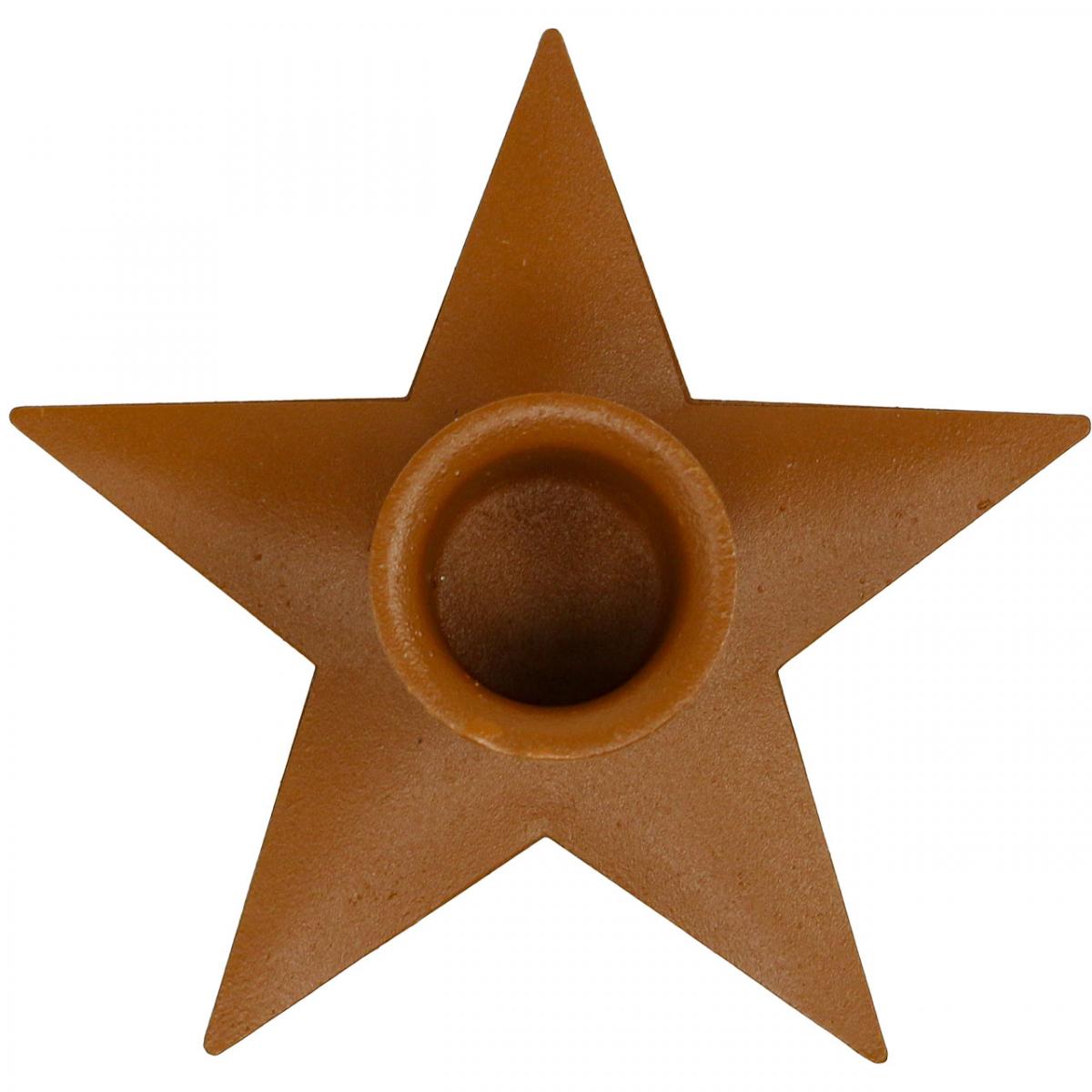 Die kleinen Stabkerzenhalter sitzen auf einem flachen Stern und sind rostbraun lackiert. Die Kerzenständer lassen sich direkt auf eine gegen Hitze unempfindliche Unterlage setzen.