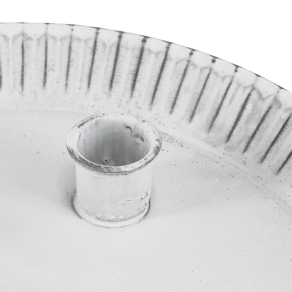 Mit einem Durchmesser von 25 cm bietet der Kerzenteller aus Metall ausreichend Platz für vier Kerzen Ihrer Wahl und ermöglicht durch sein schlichtes Design vielfältige Deko-Arrangements im Vintage-Stil. Abriebspuren geben dem Kerzenteller Shabby Chic. Die weiße Farbgebung lässt sich leicht in jedes Farbkonzept integrieren und verleiht Ihrer Wohnraumgestaltung einen Hauch von zeitloser Eleganz.