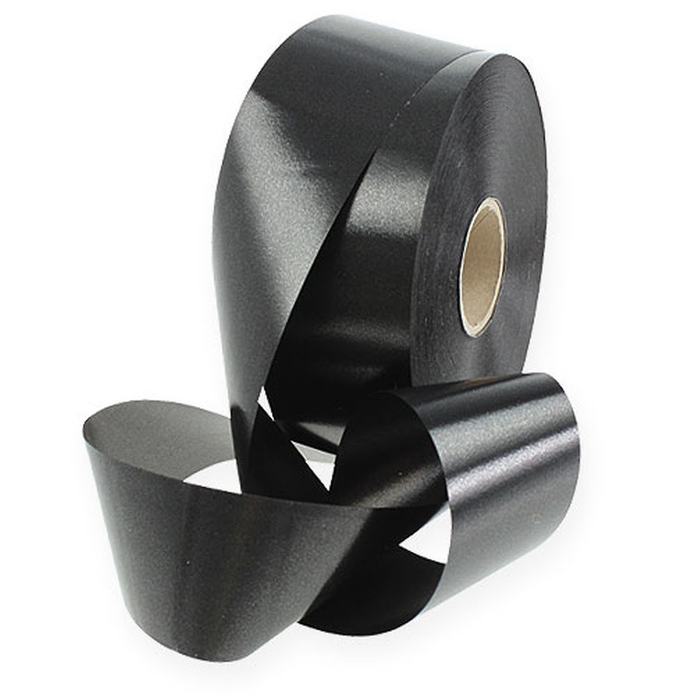 Il nastro arricciato in nero è largo circa 50 millimetri e lungo circa 100 metri. È composto al 100% da polipropilene ed è avvolto su un piccolo rotolo di cartone.