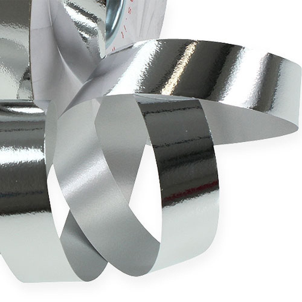 Il lucido nastro arricciacapelli in argento misura circa 19 millimetri di larghezza e circa 100 metri di lunghezza. È composto al 100% da polipropilene ed è avvolto su una bobina piatta di metallo e cartone.