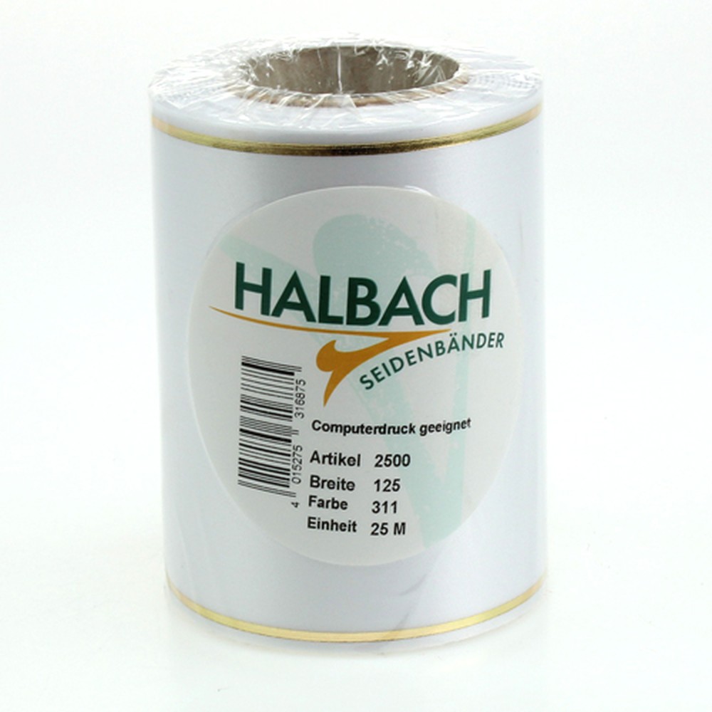 Weißes Kranzband mit Goldkante für Computerdruck, Satin Schleifenband, Wasserfest, 25m x 125mm