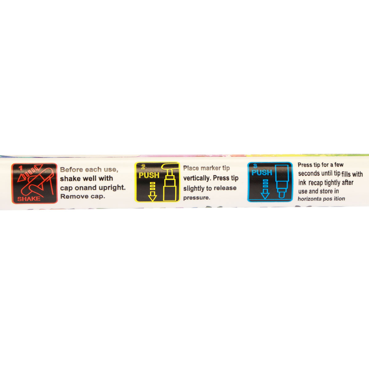 Vor jeder Benutzung sollten Sie den Stift mit der Spitze nach oben gut schütteln, bevor Sie die Kappe abziehen. Danach öffnen Sie den Stift, stellen ihn senkrecht nach oben und drücken kurz auf die Spitze, um den Marker zu entriegeln. Anschließend drücken Sie den Stift einige Sekunden leicht gegen eine saubere Oberfläche. So kann sich die Spitze des Kreidestifts mit der Marker-Flüssigkeit füllen.