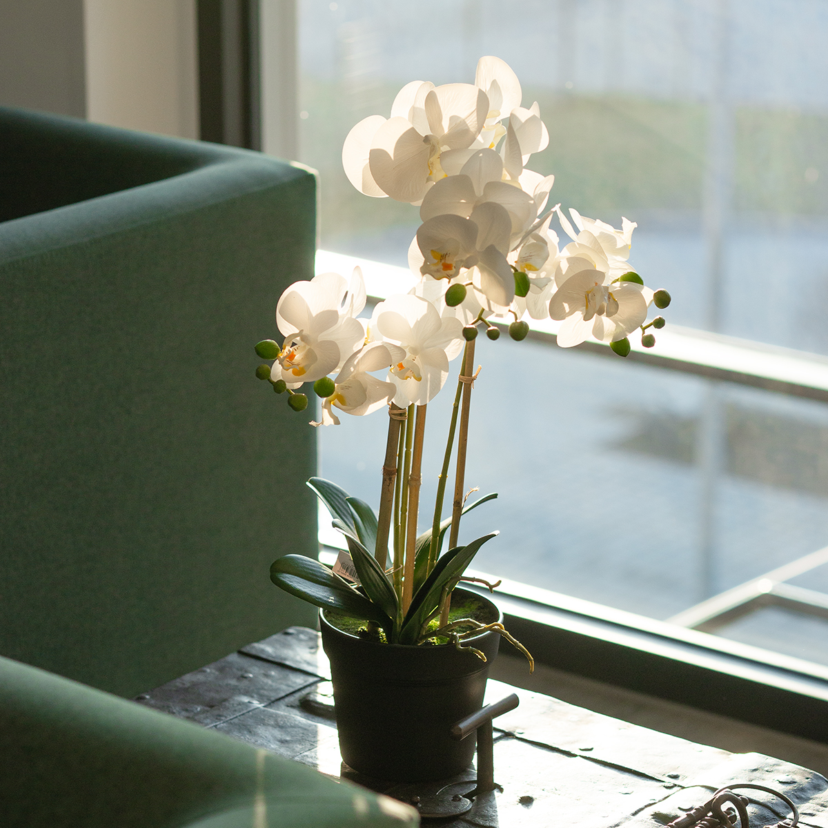 Pourquoi cette orchidée est-elle si populaire ? Elle allie facilité d’entretien et attrait visuel d’une vraie plante. Que vous préfériez un style scandinave moderne, un intérieur élégant et glamour ou une ambiance minimaliste, l’orchidée blanche s’intègre harmonieusement. Elle est particulièrement mise en valeur par des vases et accessoires en verre ou en or. Créez une atmosphère accueillante chez vous ou au bureau, une atmosphère qui invite à la détente.