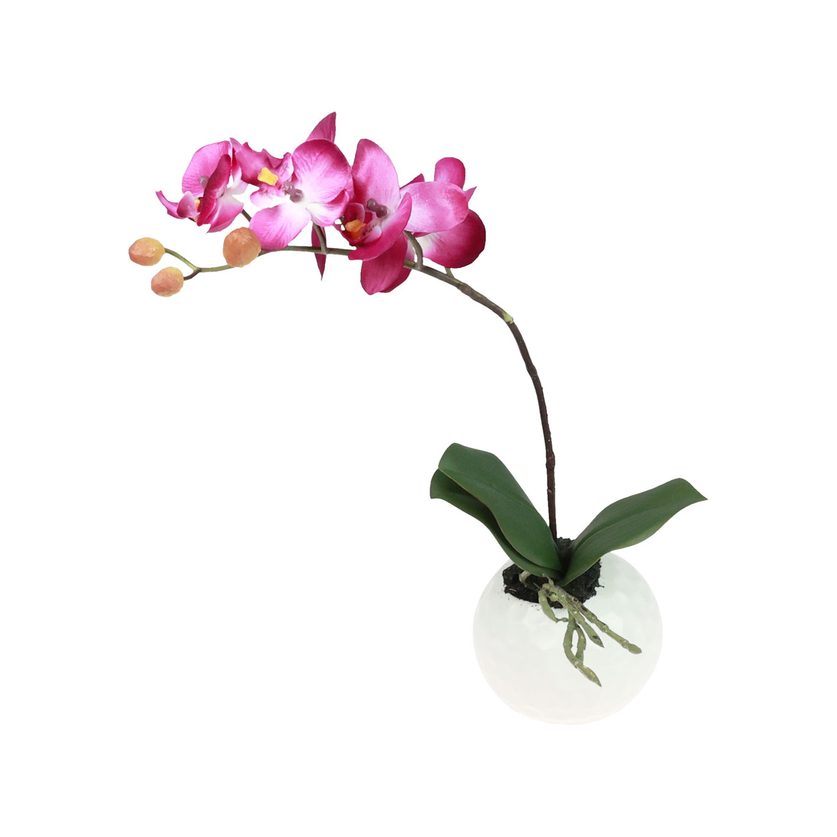 Questa orchidea artificiale in vaso assomiglia molto ad una vera phalaenopsis rosa. Il fiore di orchidea artificiale ha cinque fiori e tre boccioli. Il lungo ramo del fiore artificiale è inserito in un vaso sferico la cui struttura ricorda una pallina da golf.Tre tipiche foglie verdi, diverse radici aeree che sporgono dall'elegante vaso da fiori di design e terra artificiale nera, parte della quale è stata floccata in un colore verde muschio, completano ulteriormente l'aspetto naturale della decorazione floreale artificiale dell'orchidea.