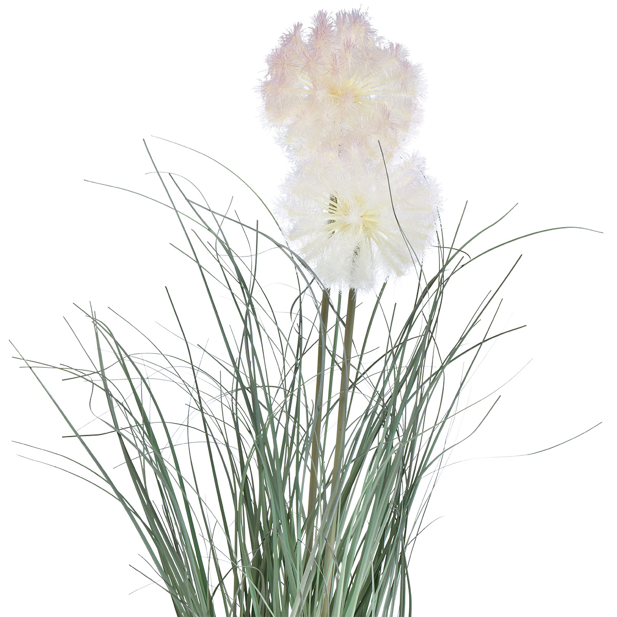 Ganz klare Stars dieser künstlichen Topfpflanze sind die zwei großen, buschigen Kugeln der Wiesenblume. Die Samen sind so wirklichkeitsgetreu gestaltet, als könnte sie der Wind jederzeit davontragen.