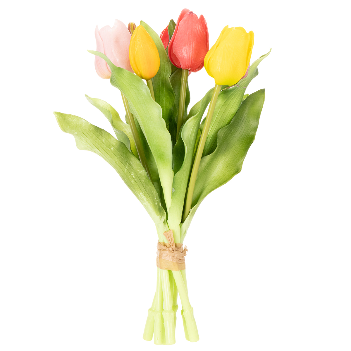I tulipani sono sempre stati simbolo di amore, eleganza e nuovi inizi. I fiori rossi rappresentano la passione, mentre il giallo simboleggia l'amicizia e l'ottimismo. I tulipani rosa, invece, emanano un delicato romanticismo e sono un modo meraviglioso per esprimere affetto. Questa armoniosa combinazione di colori permette a questi fiori artificiali di integrarsi in quasi ogni stato d'animo o messaggio. Sono ideali per trasmettere gioia o esprimere gratitudine.