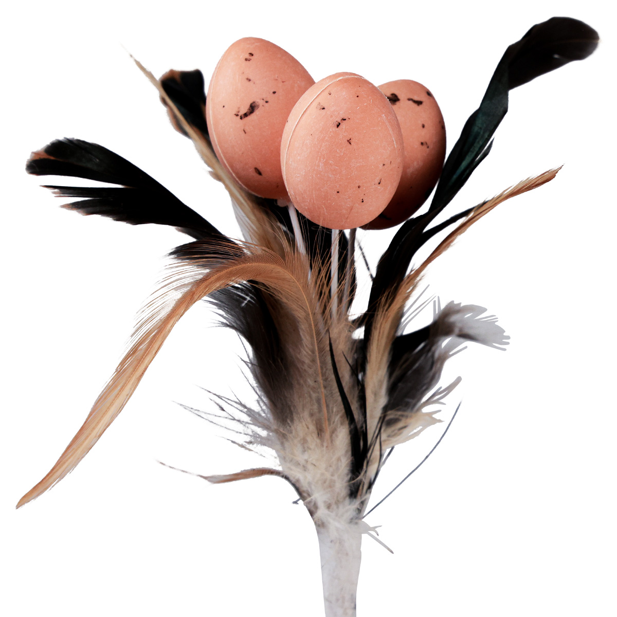 Unsere künstlichen Eier am Stab verbinden natürliche Anmutung mit praktischer Robustheit. Das sanfte Weiß der Wachteleier wird akzentuiert durch die schwarzen Federn mit ihren warmen Braun-Nuancen, die von den farblich abgestimmten Fasanenfedern ergänzt werden. Egal ob einzeln oder im Arrangement, diese Mini-Ostereier bieten vielseitige Dekorationsmöglichkeiten.