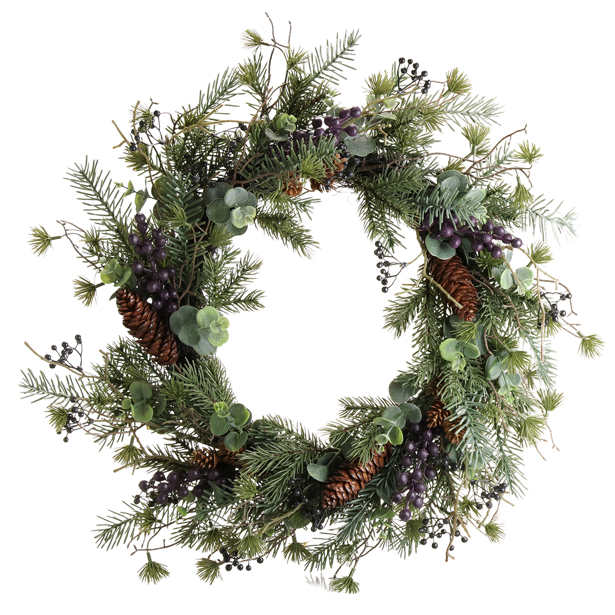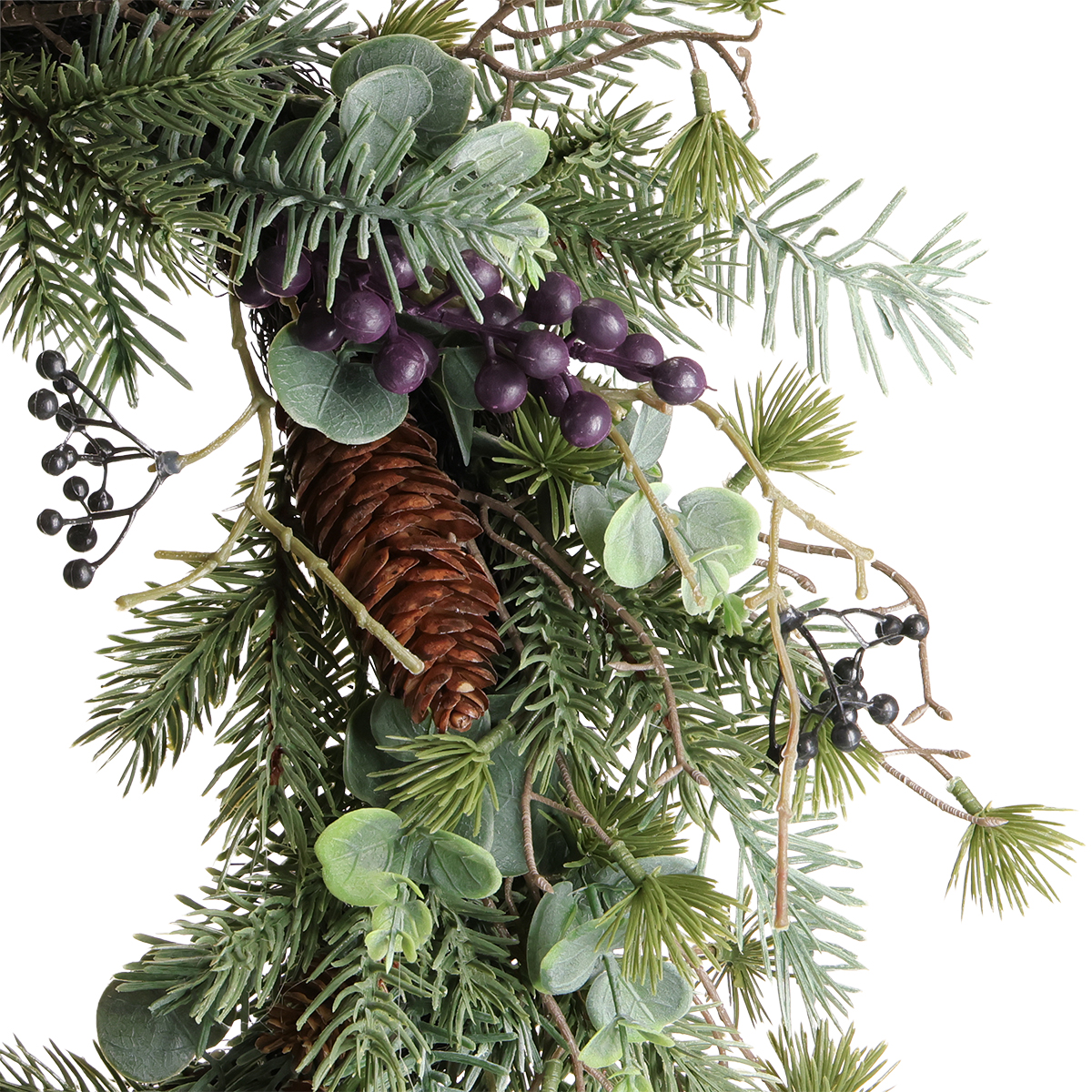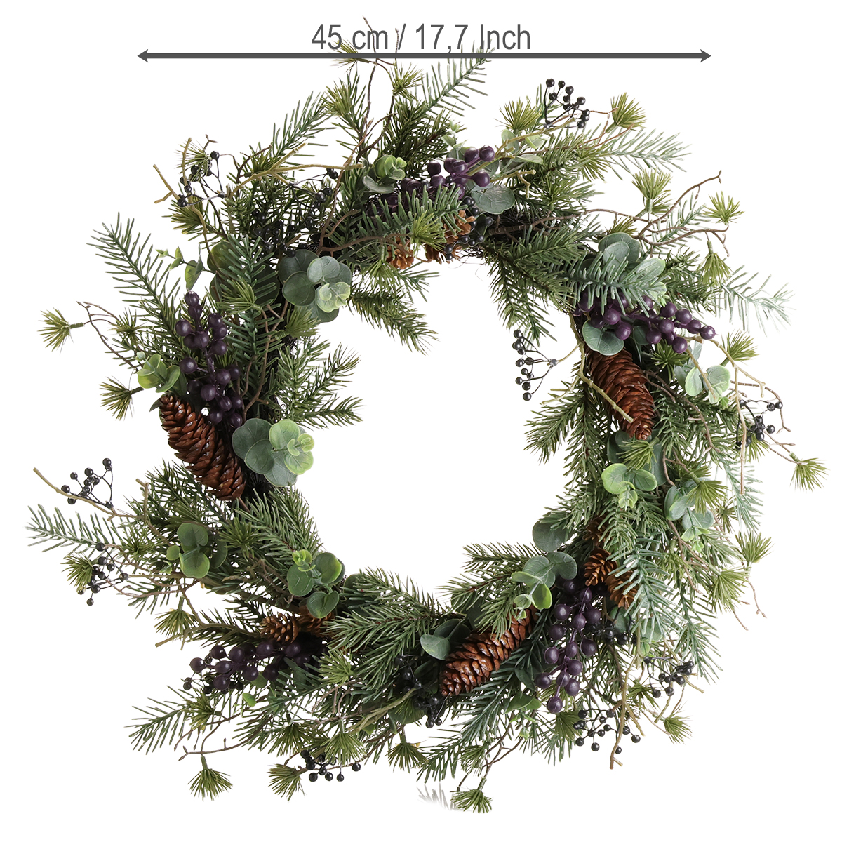 - Material: Künstlicher Rebenkranz mit Eukalyptus, Zapfen und verschiedenem Nadelgrün