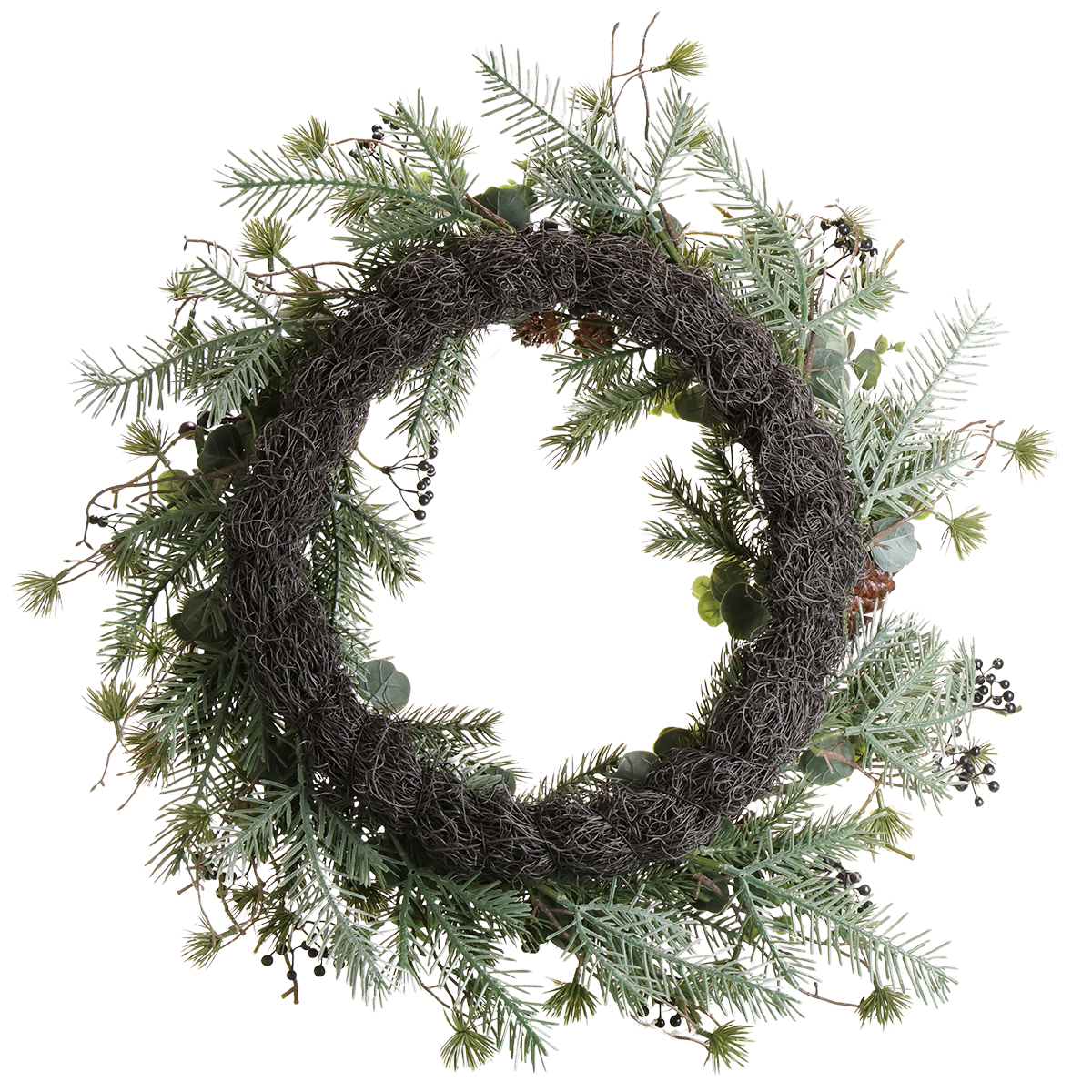 - Matériau : Couronne de vigne artificielle avec eucalyptus, cônes et diverses aiguilles de verdure
