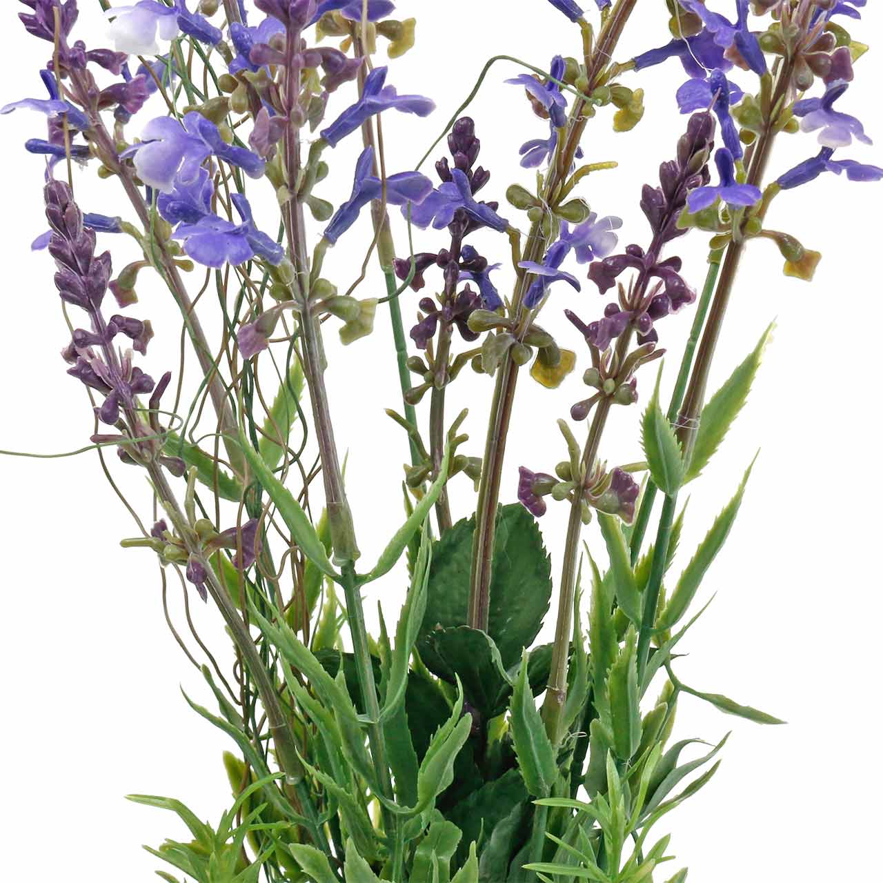 Die Blütenstände des Deko-Lavendels und sein Blattwerk wurden sehr natürlich nachgearbeitet. Im Bund sind neben zehn Lavendelzweigen unterschiedlichr Wuchshöhe noch Stängel die Thymian und schmalem Gras ähneln eingearbeitet, was das Bündel sehr authentisch wirken lässt.