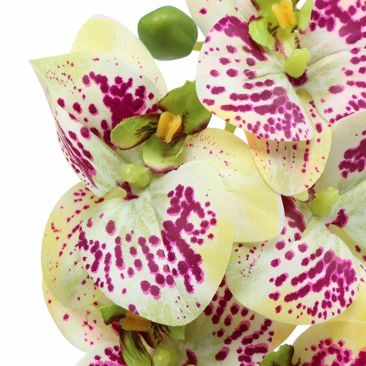 L'orchidea di farfalla (Phaelaenopsis latina) è l'epitome dell'orchidea per eccellenza. E con questo ramo di orchidea artificiale nei colori verde, rosa, giallo e viola, porti un rappresentante artificiale di questo genere in casa che difficilmente può essere distinto da un ramo originale. Qui i produttori hanno esaminato attentamente e imitato i modelli naturali!