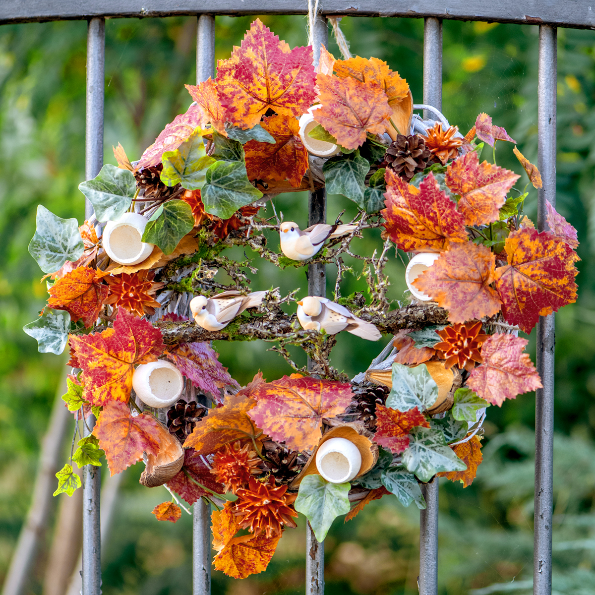 Neben dem Hänger finden Sie im selben Stil hier bei uns im Shop auch Blättergirlanden und weitere Kunstpflanzen. Sie alle haben die grünen Stiele mit den natürlich fleckig gestalteten rot-orangenen Blättern.