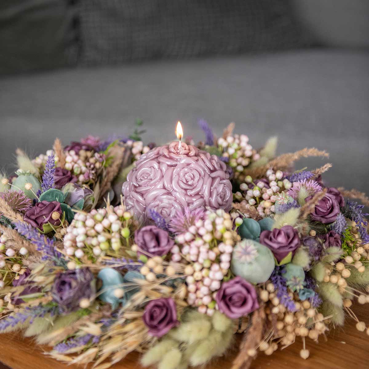 So ist die runde Kerze in Altrosa ein Highlight auf einem Deko-Tablett oder im Gesteck für die Tischdeko. In Dekorationen im nostalgischen Stil alter englischer Gärten bringen Sie mit der Kugelkerze das perfekte Accessoire. Wenn Sie getrocknete Rosenblüten oder eine Kunstrose dazu arrangieren, lässt es sich bei Kerzenschein wunderbar den Tagträumen vom Rosengarten nachhängen.