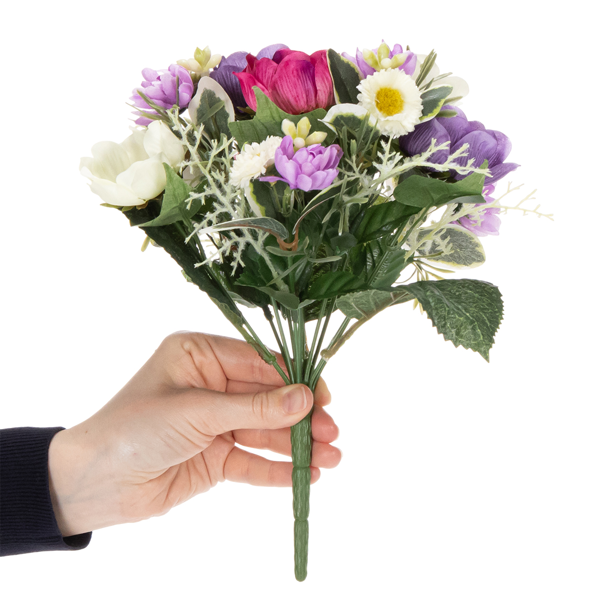 Un bouquet di fiori artificiali che non è solo decorativo, ma porta anche una gioia duratura. Questo modello, realizzato in poliestere e plastica, offre un'alternativa durevole ai fiori veri ed è ideale per chi desidera godersi l'allegria delle fioriture primaverili senza dover acquistare continuamente nuovi bouquet. I colori vivaci, dal bianco tenue al viola brillante, fino al rosa intenso, rendono questo colorato bouquet di fiori artificiali un vero e proprio colpo d'occhio.
