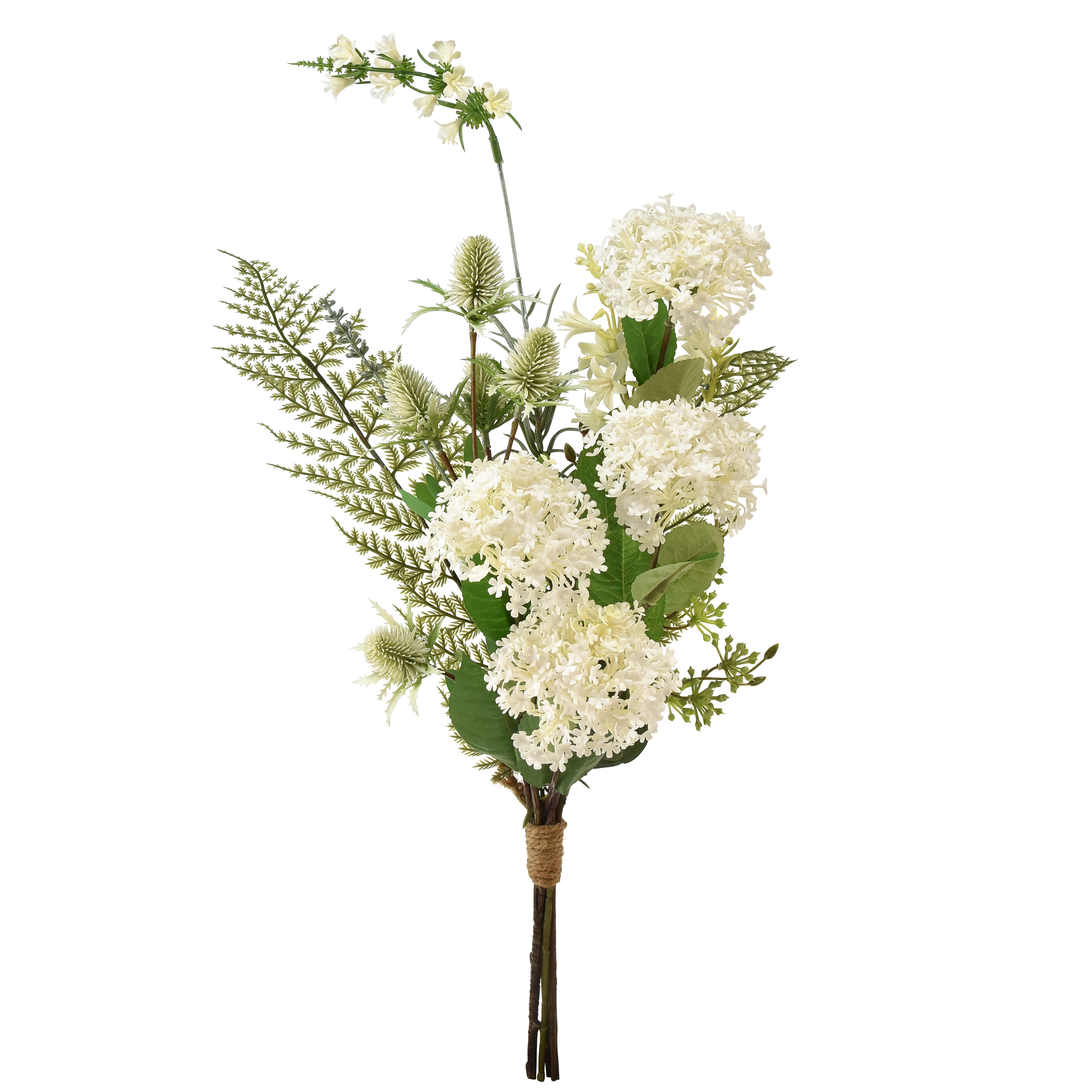 Entdecken Sie den Charme dieses hochwertigen Kunstblumenstraußes, eine dauerhafte Schönheit, die jeden Raum bereichert. Dieser Kunstblumenstrauß besteht aus Stielen weiß blühender Schneeball-Pflanzen, Wilder Karde und künstlichem Farn und verleiht Ihrem Zuhause oder Büro einen Hauch von frischem Waldflair, ohne dass Sie sich um Pflege sorgen müssen.