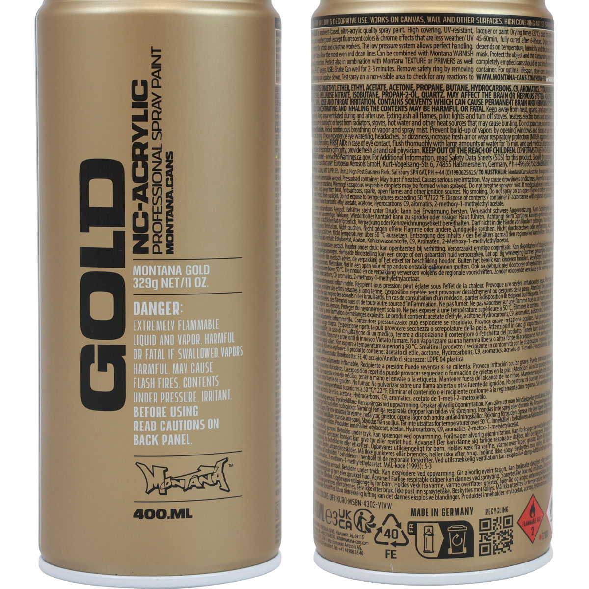 Les bombes de peinture de Montana Cans présentent également le grand avantage de pouvoir combiner de nombreux systèmes de ce fabricant entre eux. Vous pouvez utiliser n'importe quel vernis acrylique de la série Montana Gold, par exemple avec les sprays à effet métallisé et le vernis transparent de Montana.