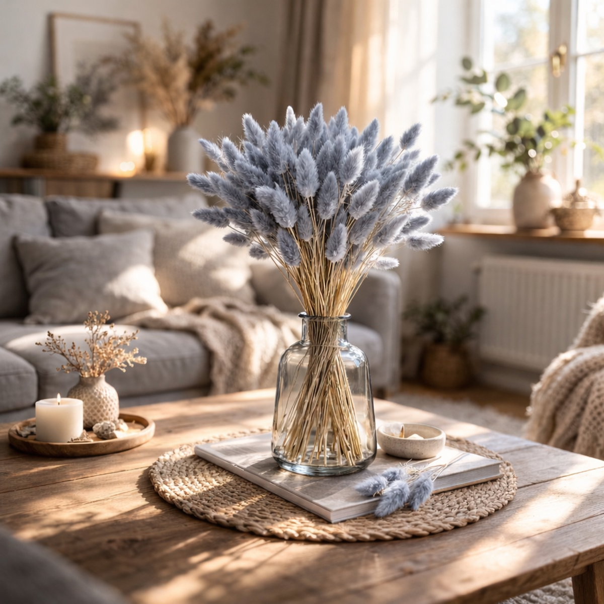 - Naturdeko im skandinavischen Stil: Kombinieren Sie das Hasenschwanzgras mit hellen Holztönen und minimalistischen Accessoires.