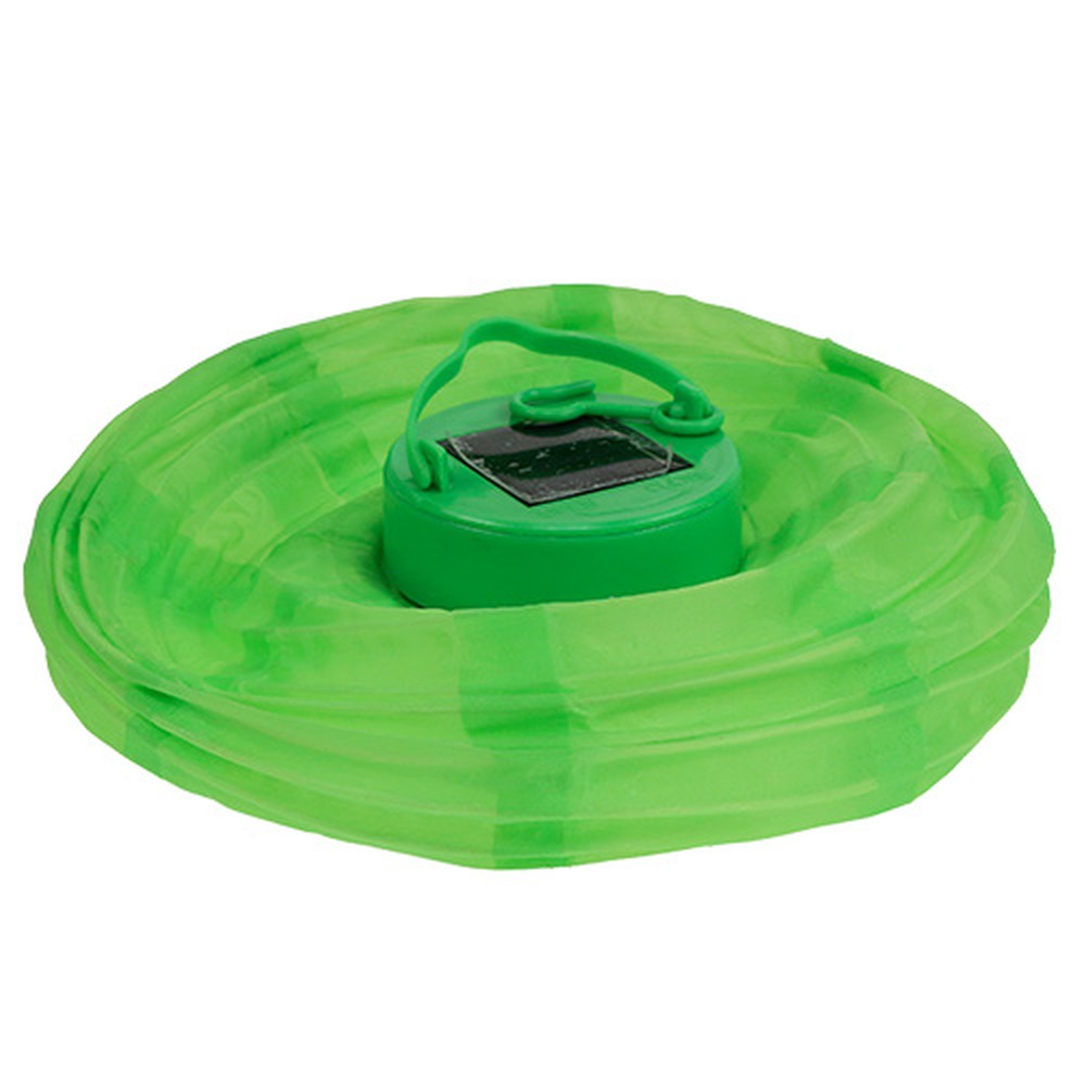 Der grüne LED-Lampion mit Solartechnik kann prima zusammengefaltet und bis zum nächsten Grillabend platzsparend verstaut werden. So besitzt er eine Größe von etwa 6 Zentimetern. Ausgeklappt hat die Partyleuchte mit ihrem Haken eine Größe von circa 30 Zentimetern. Der Durchmesser beträgt immer an die 20 Zentimeter. Mit einem On-/Off-Schalter können Sie das Gerät ein- und ausschalten, das mit einer beigefügten AA-Akku-Batterie betrieben wird.